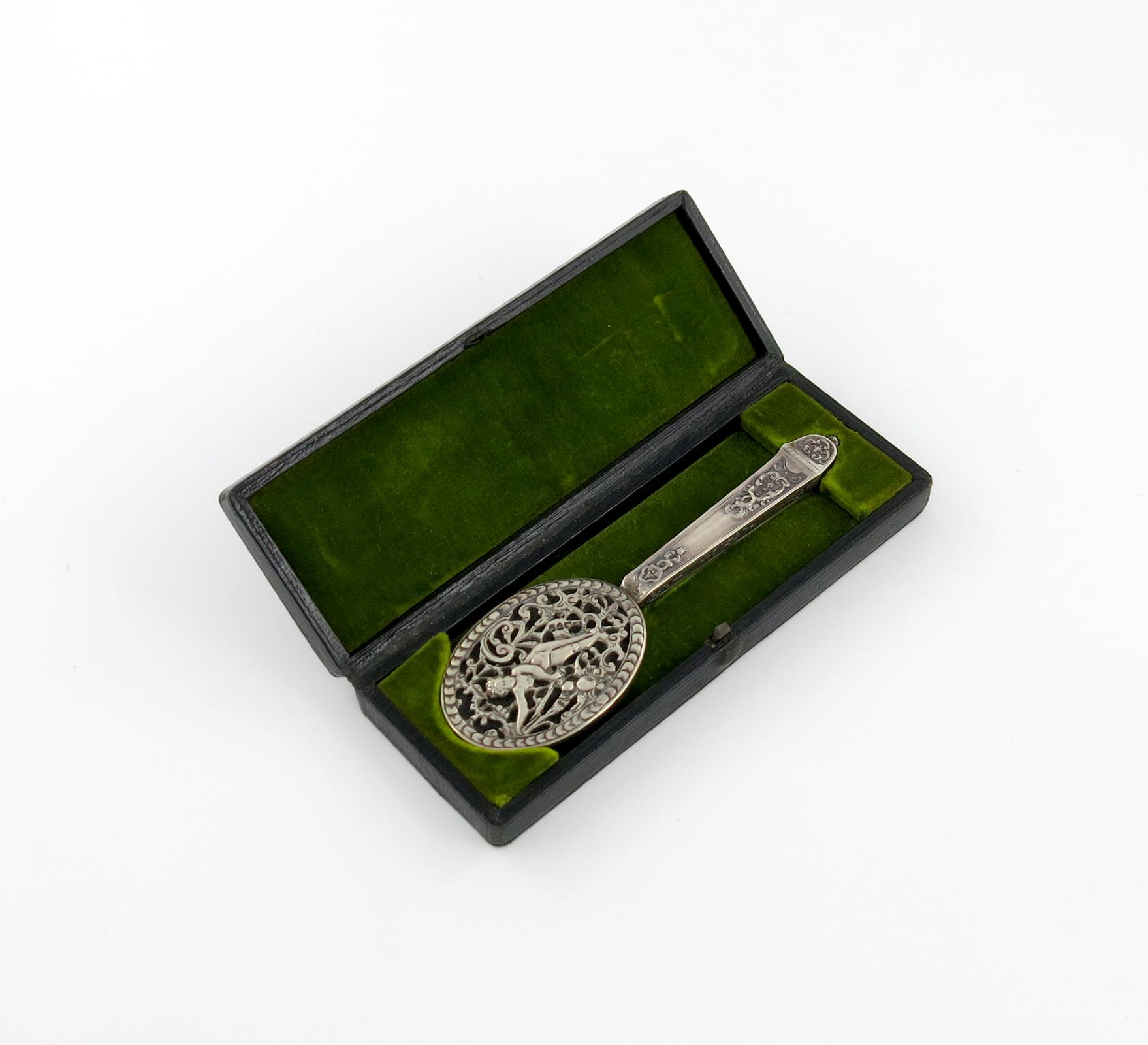 oval form, pierced with cherub and foliate scroll decoration, in a fitted case, length 13.6cm.