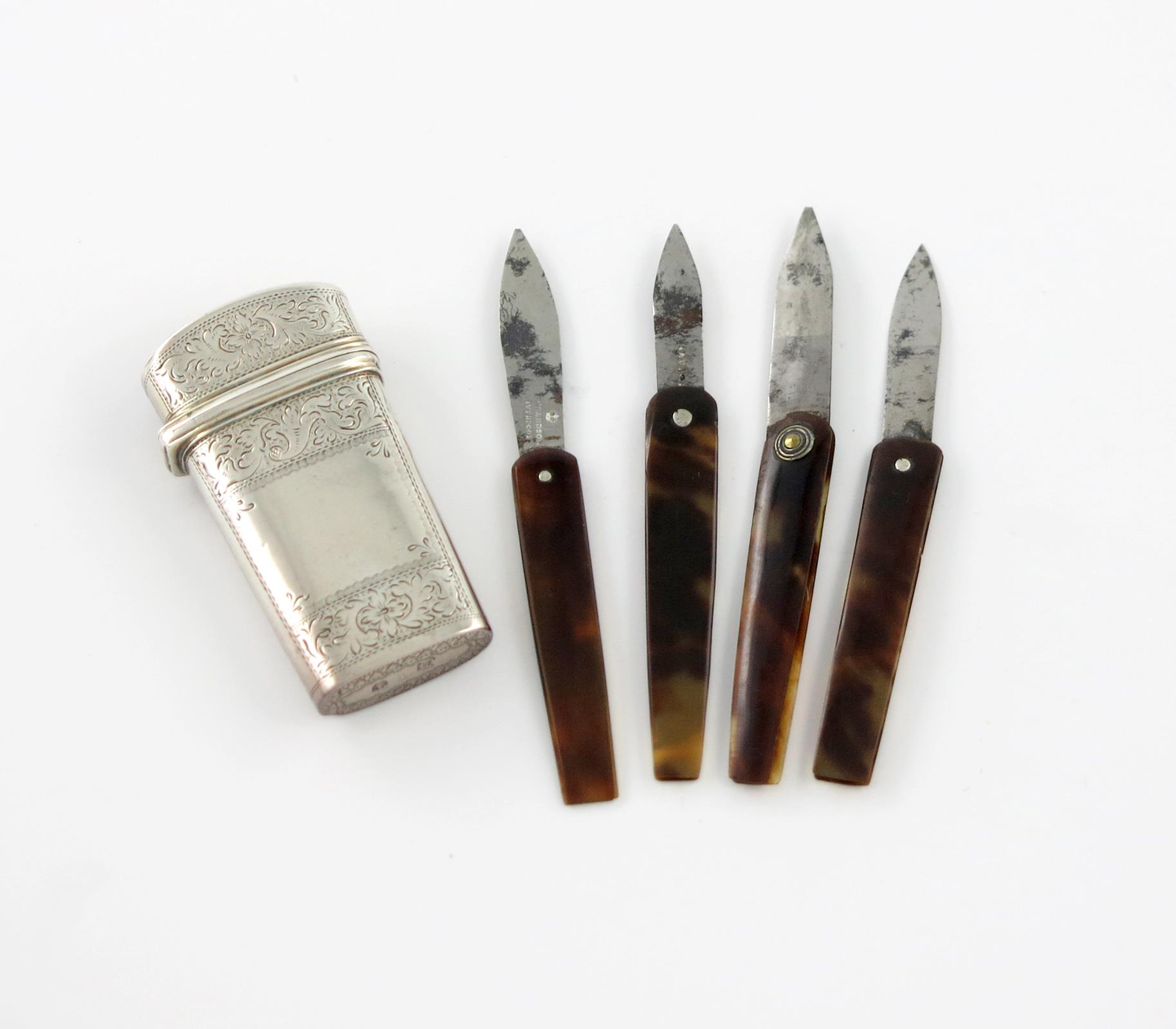 tapering rectangular form, engraved decoration, the interior with four tortoiseshell lancets, length 6.1cm, approx. weight 1.2oz.