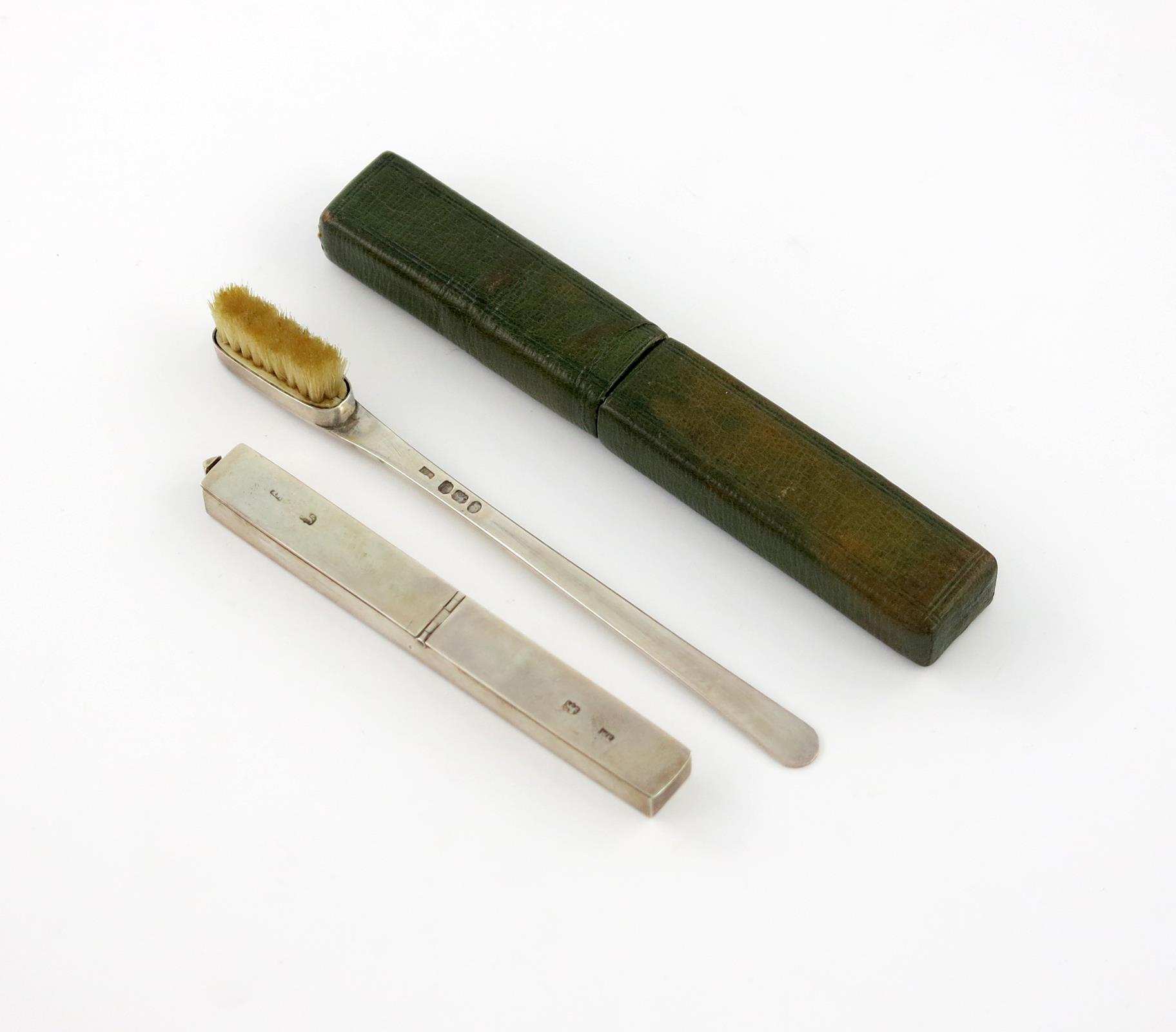 the box of plain rectangular form, with two hinged compartments, the toothbrush of plain form, in a fitted green case, length of box 9.3cm.