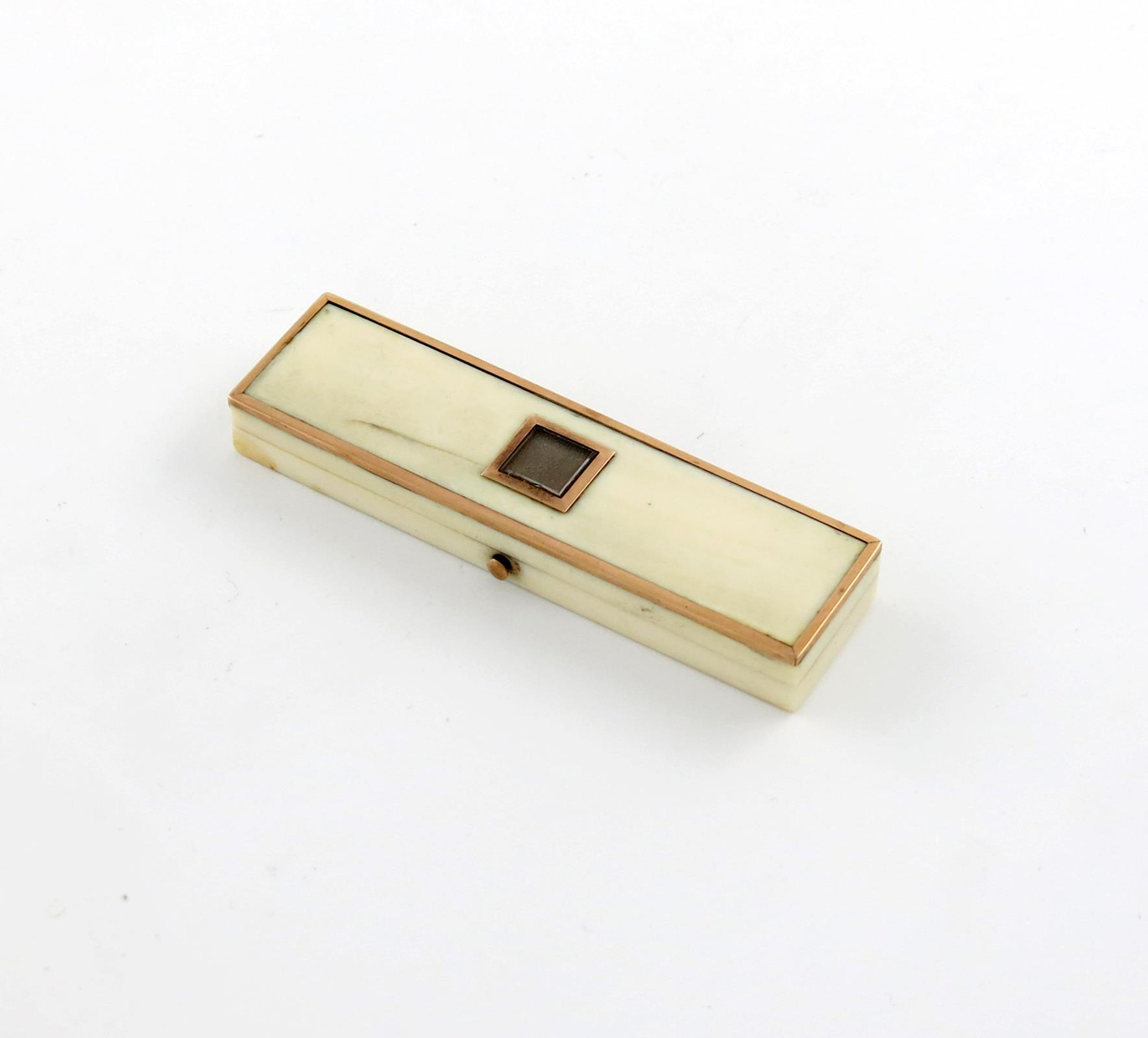 rectangular form, plain mounts, the hinged cover with a cartouche, the interior with three toothpicks, length 8.2cm.