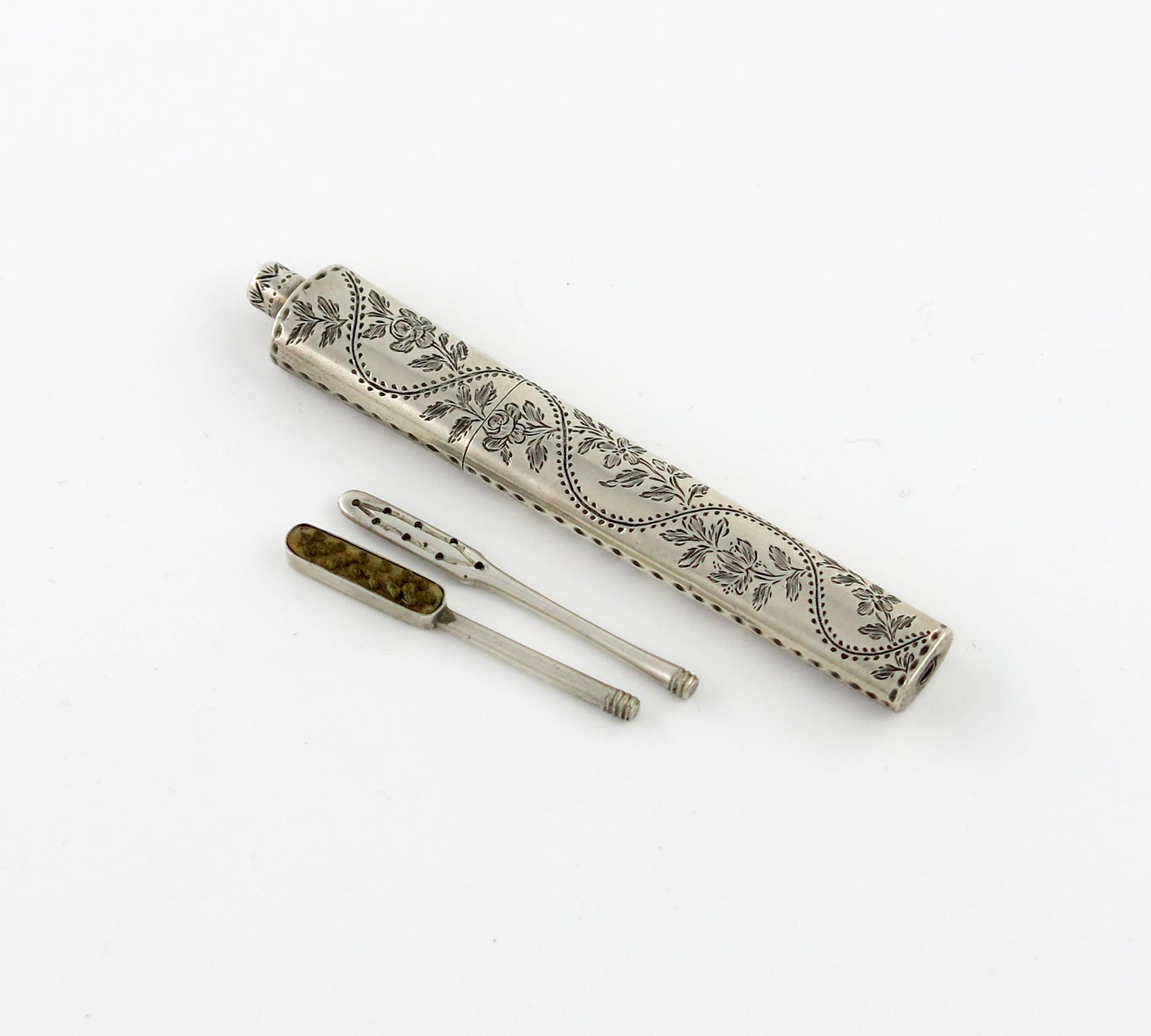 tapering oblong form, engraved decoration, the pull-off cover with a powder flask, the interior with a screw-in brush and implement, length 10.5cm, approx. weight 0.7oz.