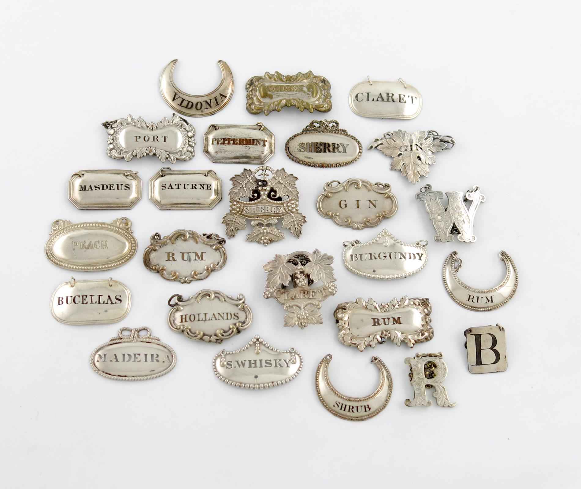 A collection of twenty-five old Sheffield plated and electroplated wine labels,