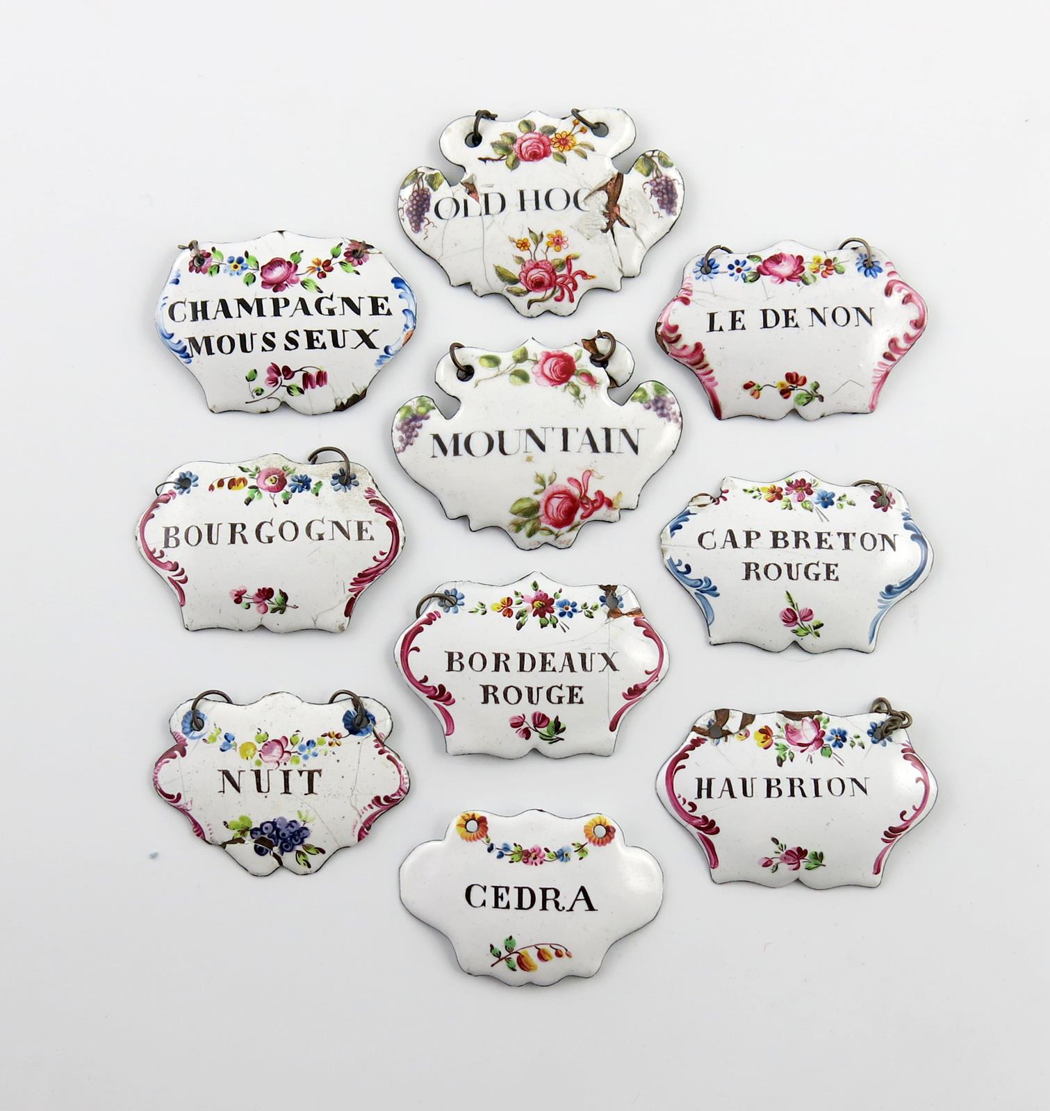 cartouche and escutcheon form, with black lettering on a white ground decorated with flowers, including: 'NUIT', 'CAP BRETON ROUGE', 'CHAMPAGNE', 'MOUSSEUX', 'MOUNTAIN', and 'HAUBRION', and other titles. (10)