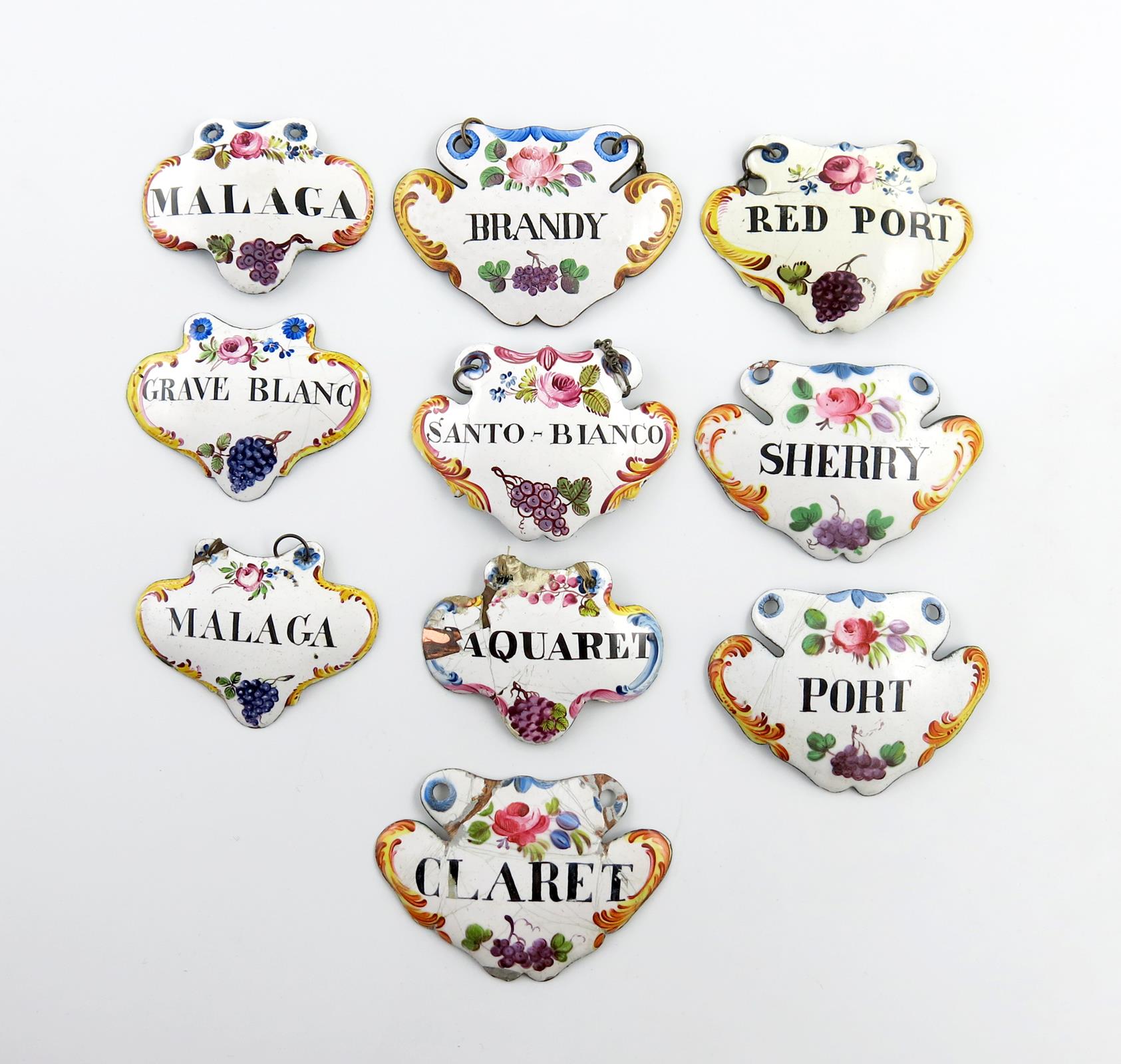 A collection of ten enamel wine labels,