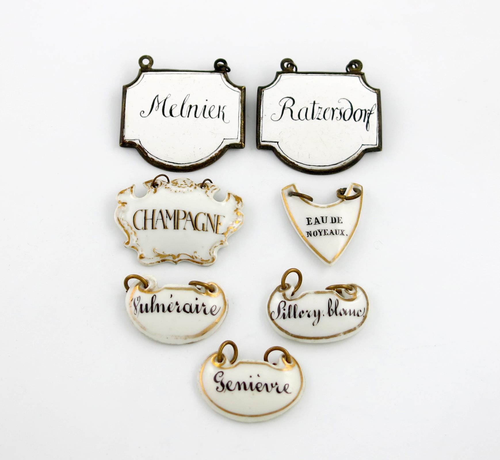 comprising: an enamelled pair, titled 'RATZERSDORF' and 'MELNIEK', plus five ceramic examples: one of escutcheon form, titled 'CHAMPAGNE', one 'EAU DE NOYEAUX' and three others. (7)