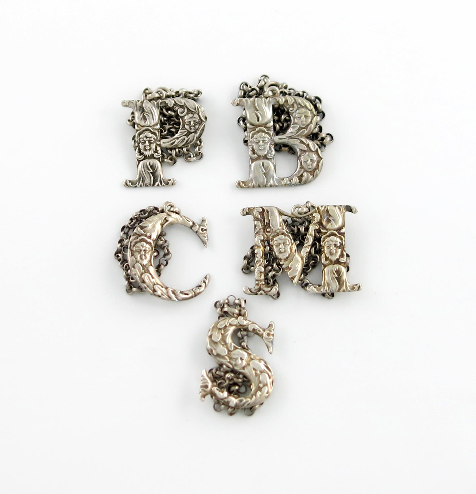 with foliate and mask decoration, modelled 'M', 'P', 'S', 'B' and 'C', approx. weight 1.2oz. (5)