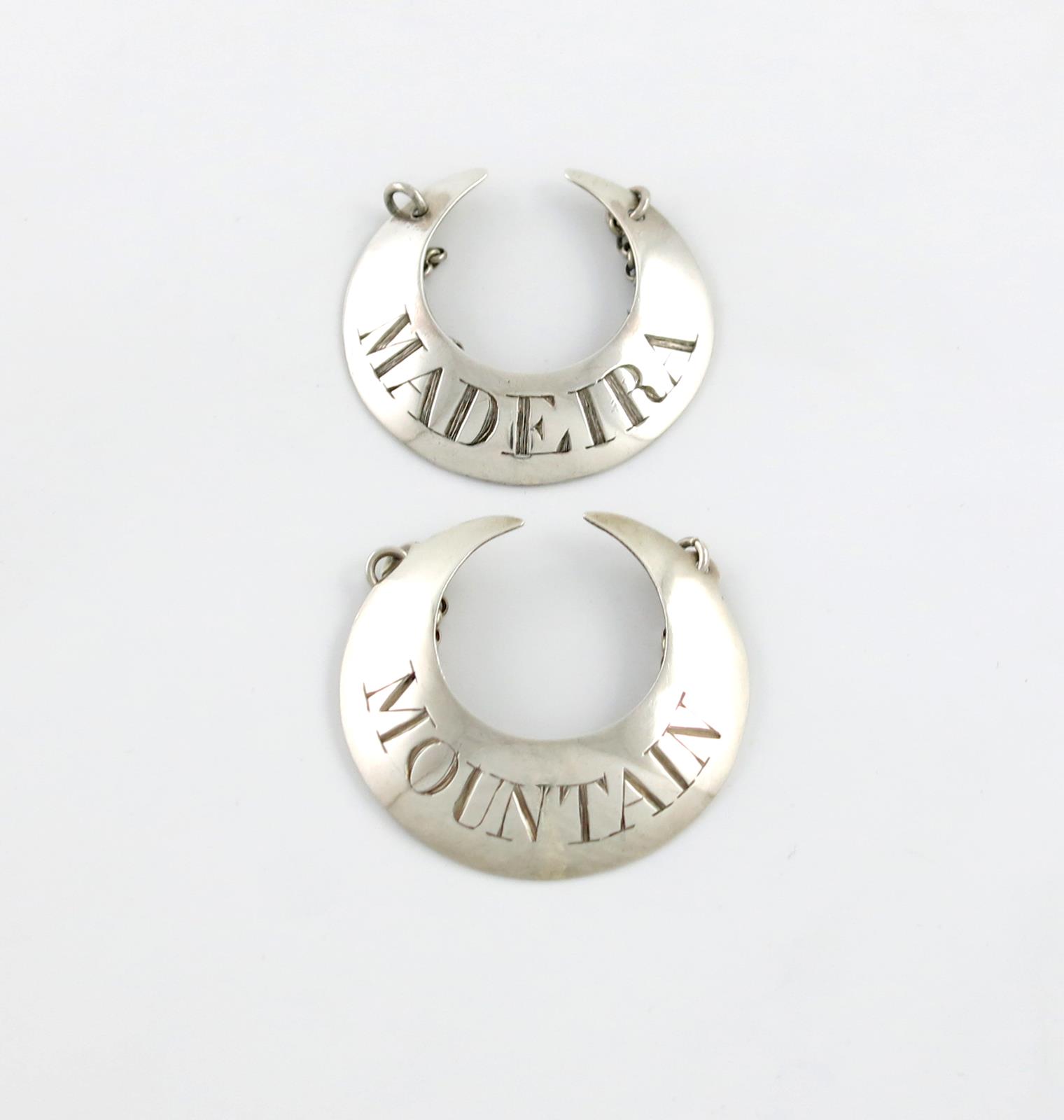crescent form, incised 'MOUNTAIN', length 4.8cm, plus a George III silver wine label, by Sandilands Drinkwater, crescent form, incised 'MADEIRA', approx. weight 0.7oz. (2)