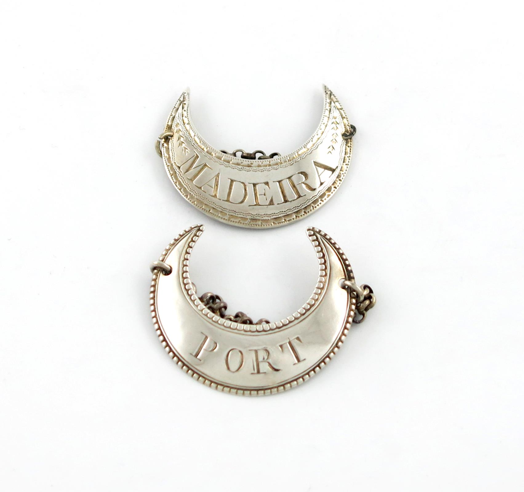 crescent form, bright-cut border, incised 'MADEIRA', and another George III silver wine label, crescent form, beaded border, 'PORT', approx. weight 0.5oz. (2)