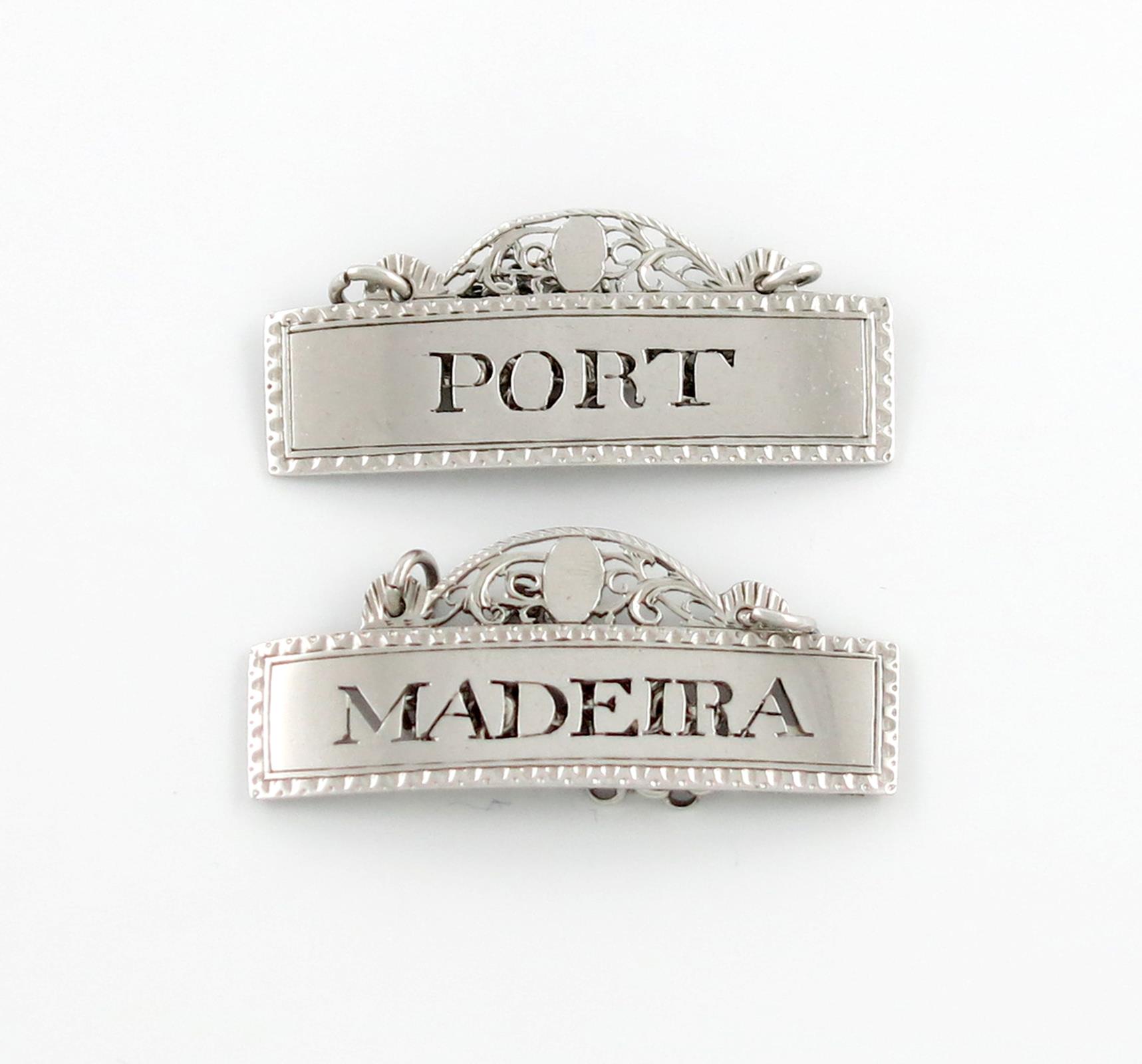 rectangular form, pierced raised pediment, incised 'PORT' and 'MADEIRA', length 4.8cm, approx. weight 0.5oz. (2)
