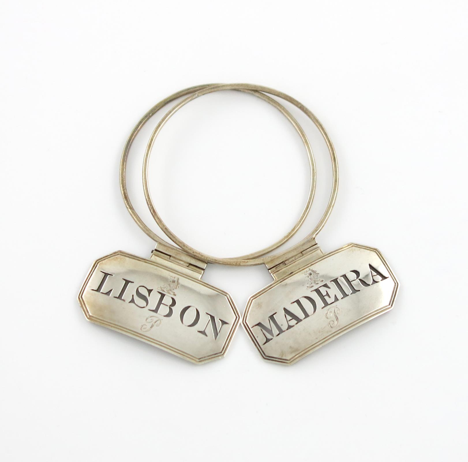 rectangular form, canted corners, reeded borders, hinged neck rings, engraved with a crest and initialled, pierced 'LISBON' and 'MADEIRA', length 4.8cm, approx. weight 1.1oz. (2)