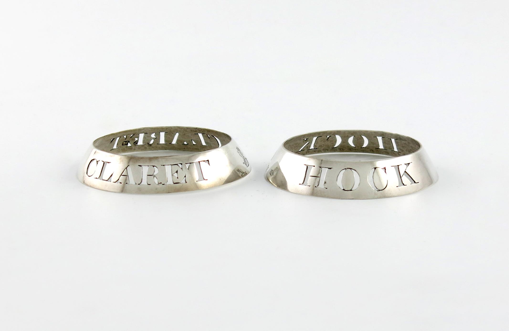 tapering form, crested, pierced 'CLARET' and 'HOCK', approx. weight 0.9oz. (2)