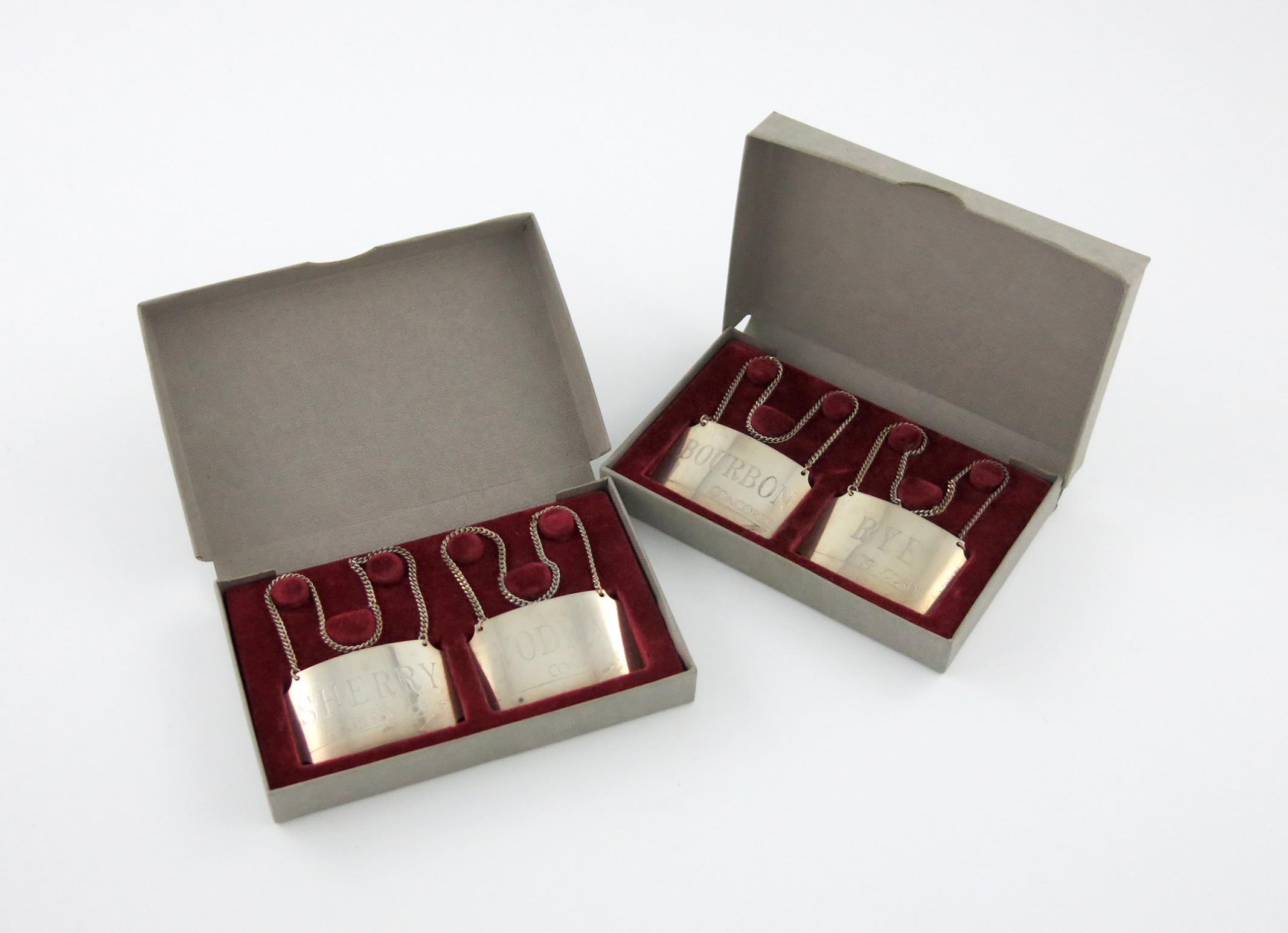 rectangular form, incurved corners, incised 'SHERRY', 'RYE', 'VODKA' and 'BOURBON', in two fitted cases. (4)