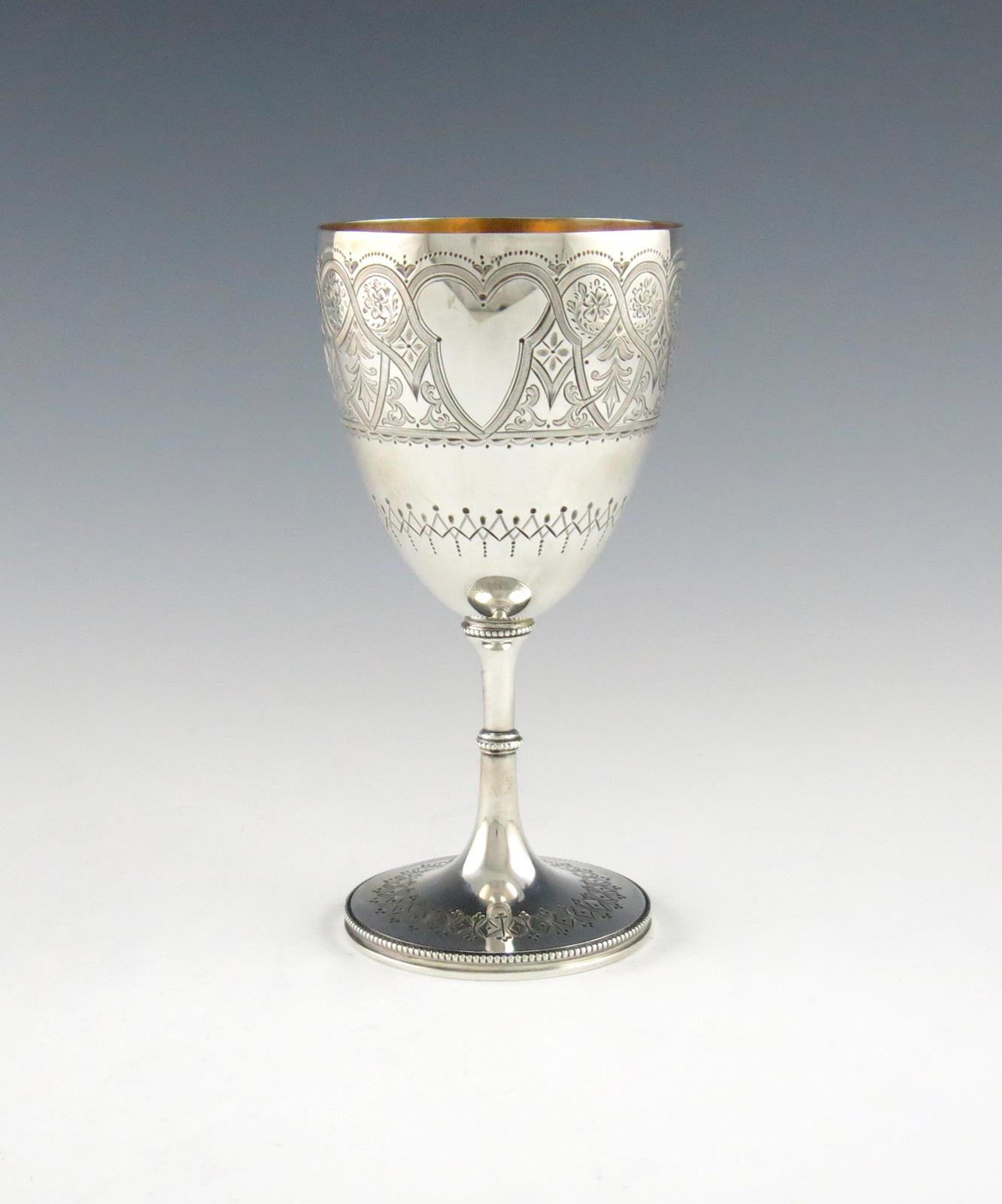 urn form, engraved decoration, gilded bowl, on a raised tapering circular foot, beaded borders, height 16.4cm, approx. weight 6oz.
