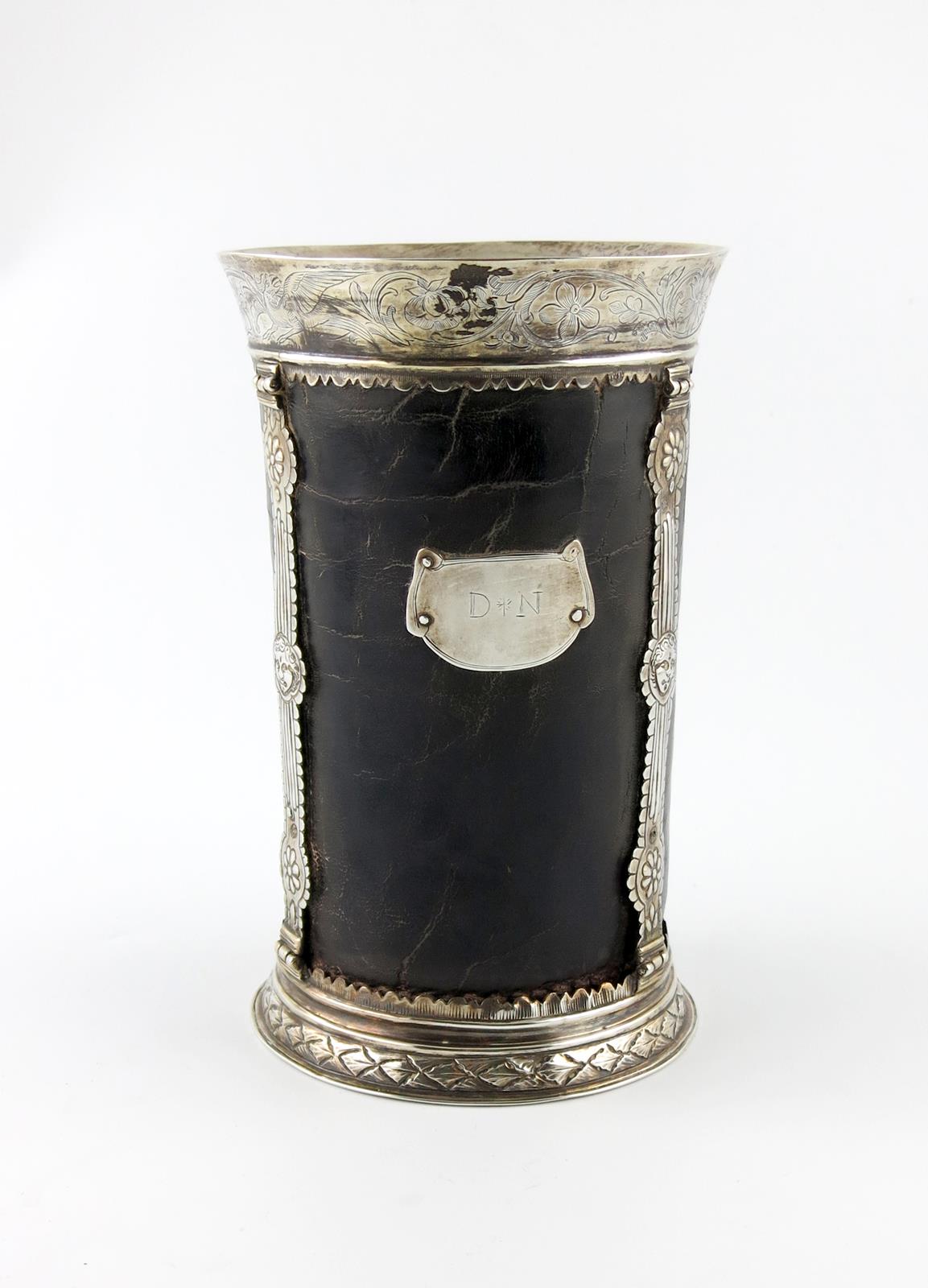 tapering oval form, the rim with engraved decoration, the body with three hinged silver strap-work supports, the front with an initialled cartouche, height 20.5cm.