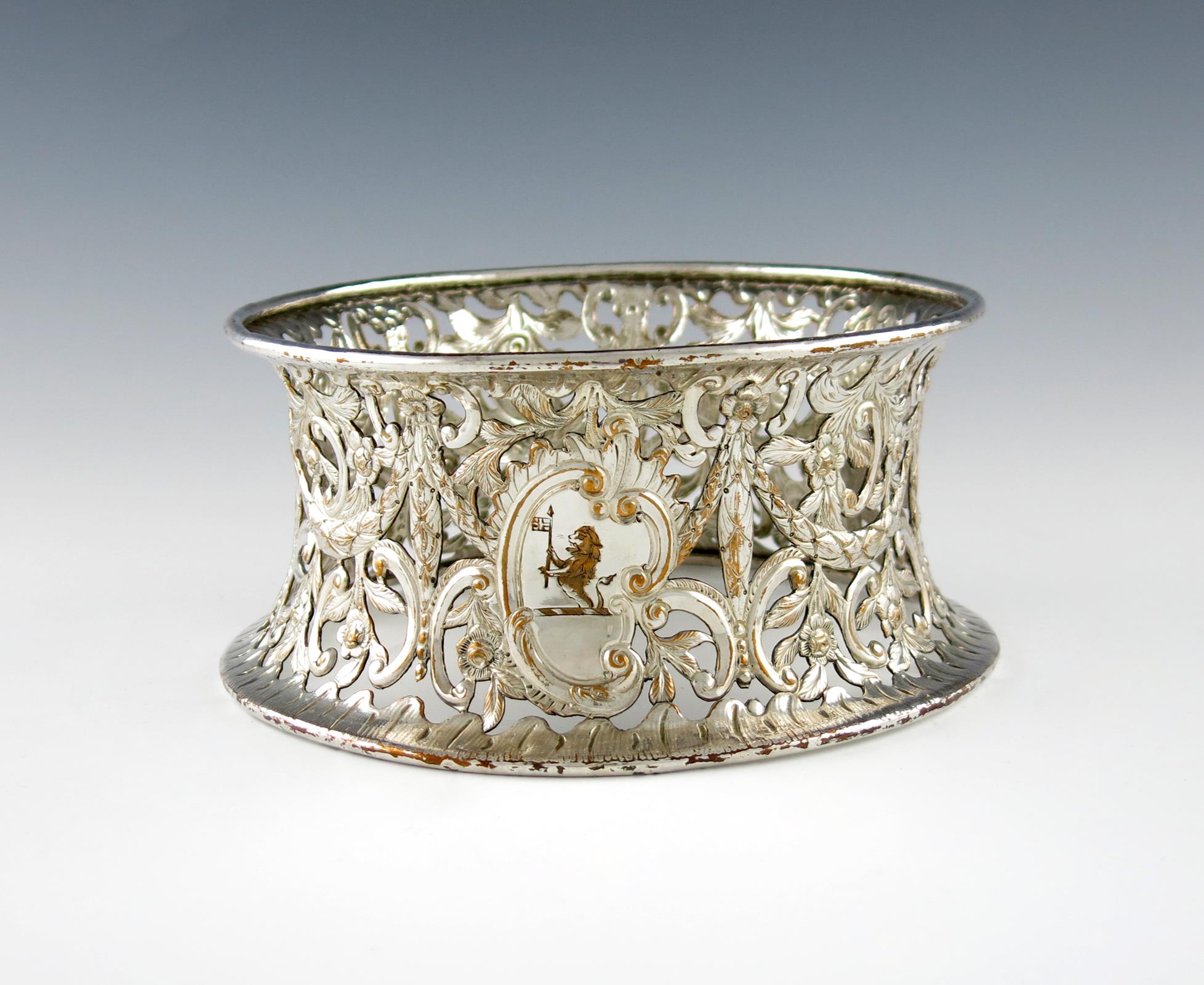 circular form, pierced and embossed foliate scroll decoration, engraved with a crest, diameter of base 19.8cm.