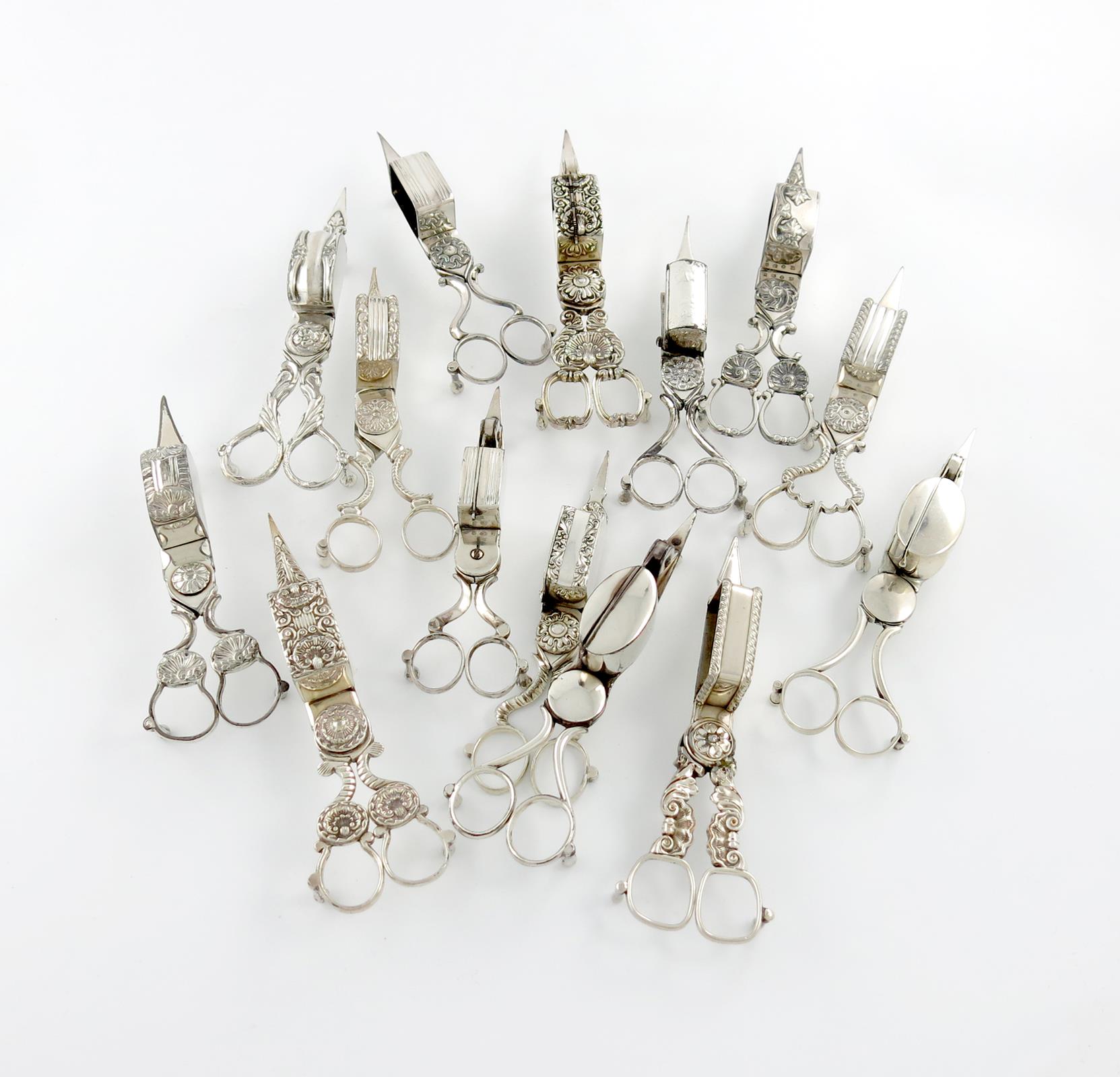 A collection of fourteen pairs of scissor snuffers,