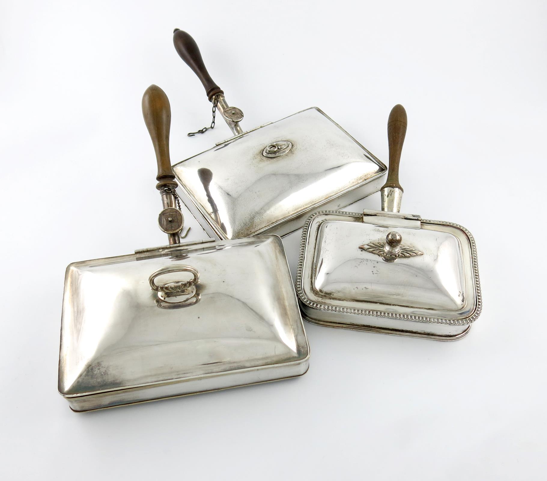 A collection of three old Sheffield plated cheese warming dishes,