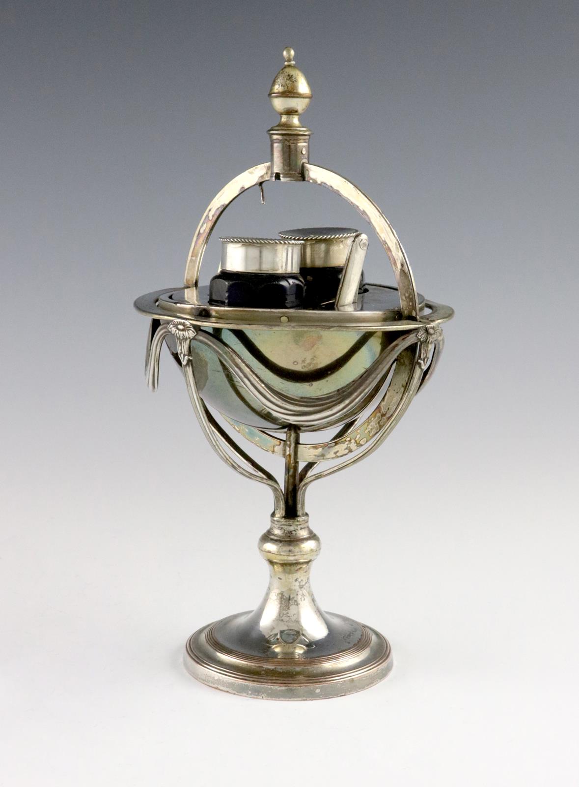 the two-section domed cover with a push-down ball finial, opening to reveal a mounted blue glass inkwell and sander, with a knife and an ivory pad, with a drape apron, on a raised circular foot, height 23cm.