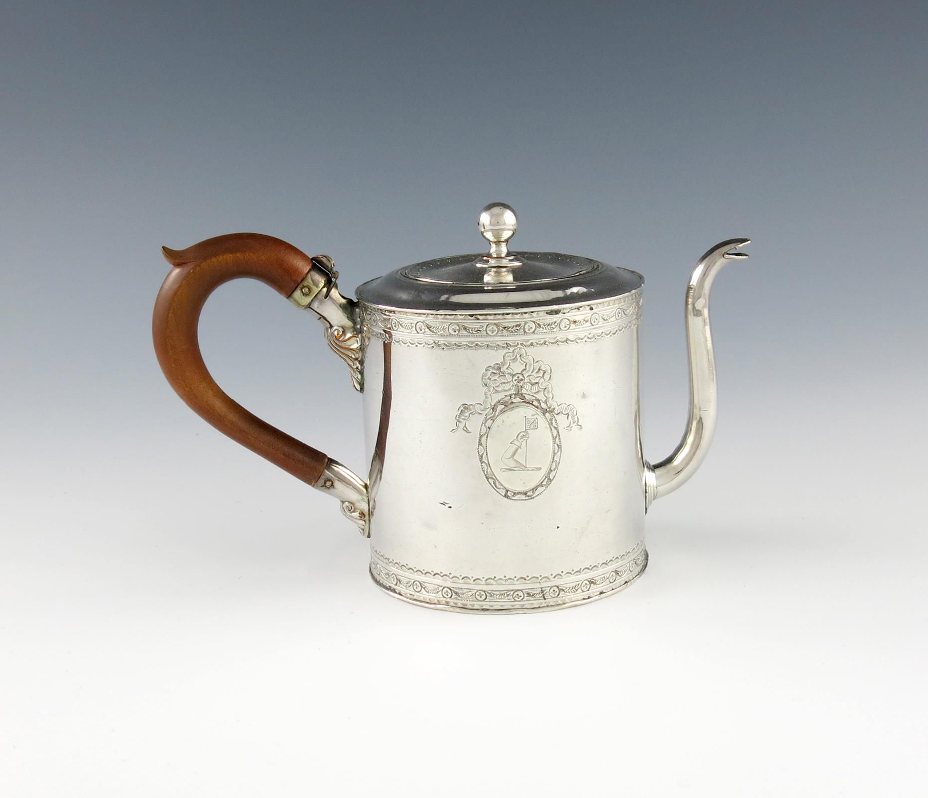 circular drum form, scroll handle, chased decoration, with an oval cartouche, pull-off cover with a ball finial, the water compartment with a hinged cover, with a crest, height 11.3cm.