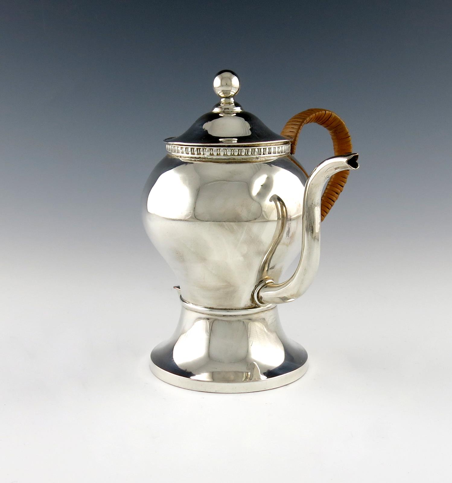 baluster form, wicker-bound scroll handle, the pull-off cover with a ball finial, the tapering circular base with a hinged water compartment, re-plated, height 18cm.