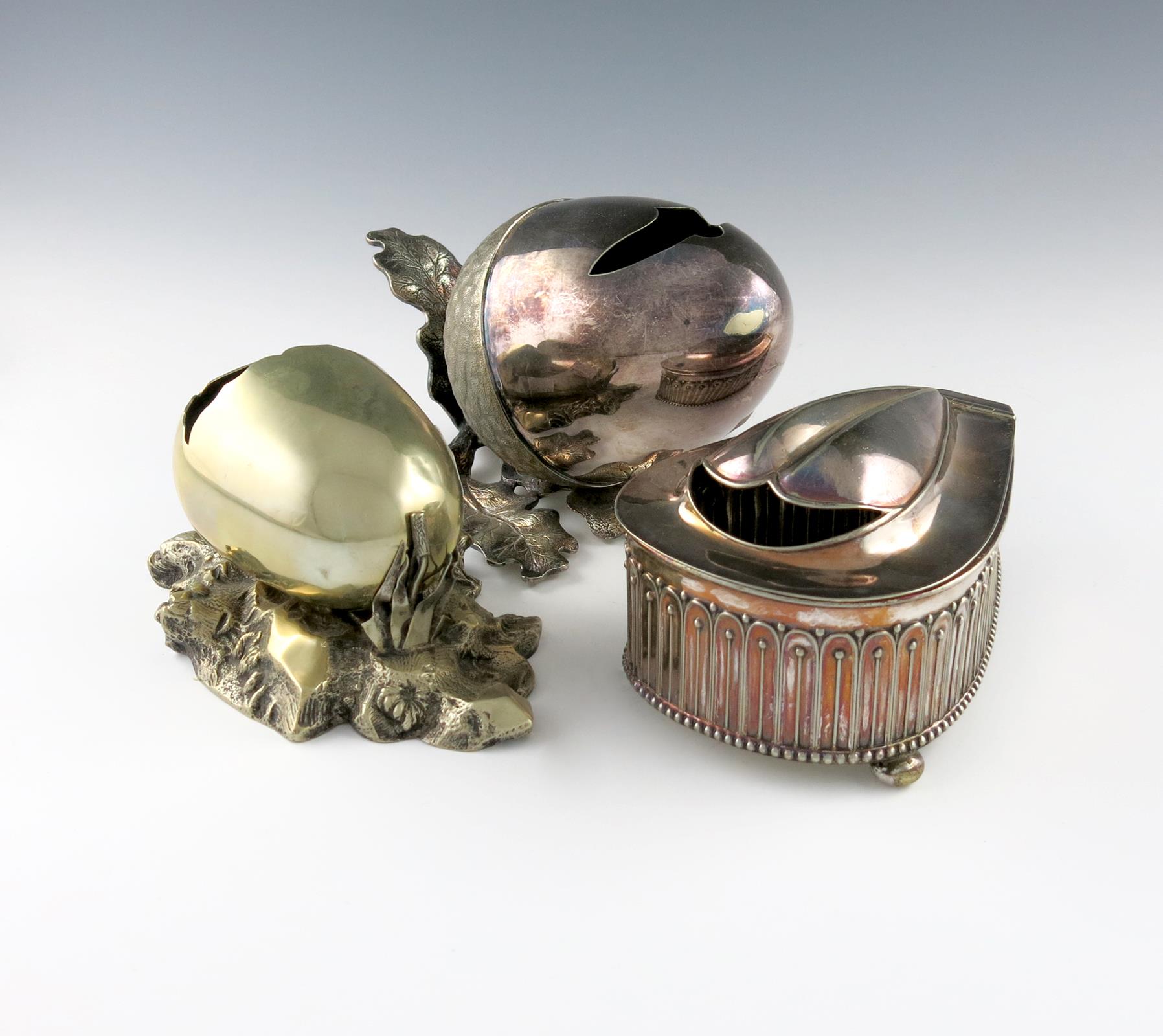 comprising: one modelled as an acorn, by Roberts and Belk, on an oak leaf base, one modelled as an egg amongst bullrushes and one other. (3)