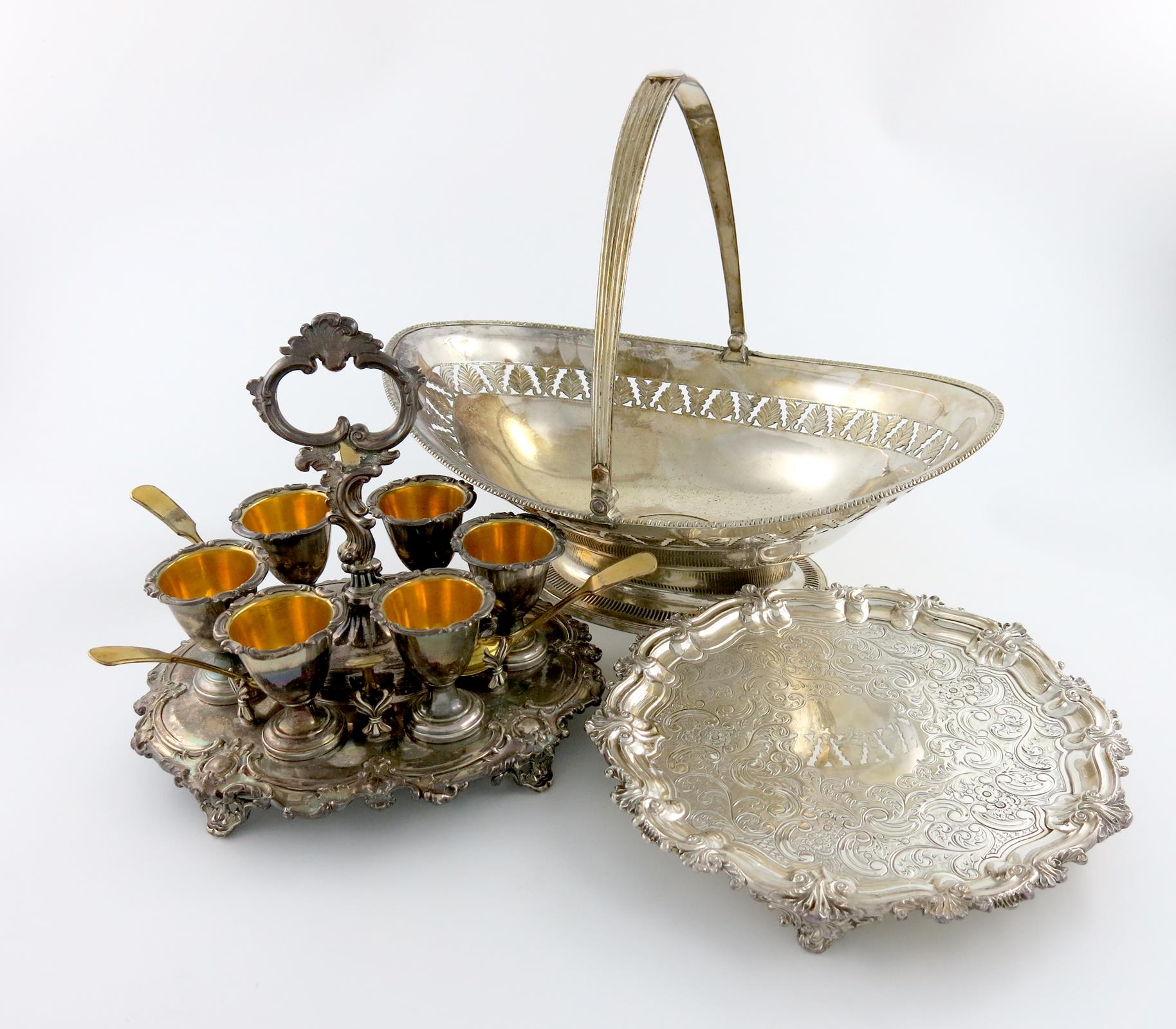 oval form, pierced foliate decoration, gadroon border, fluted swing-handle, on a raised pierced oval foot, length 35.4cm, plus an old Sheffield plated six egg cup cruet stand, with six gilt spoons, and an old Sheffield plated waiter. (3)