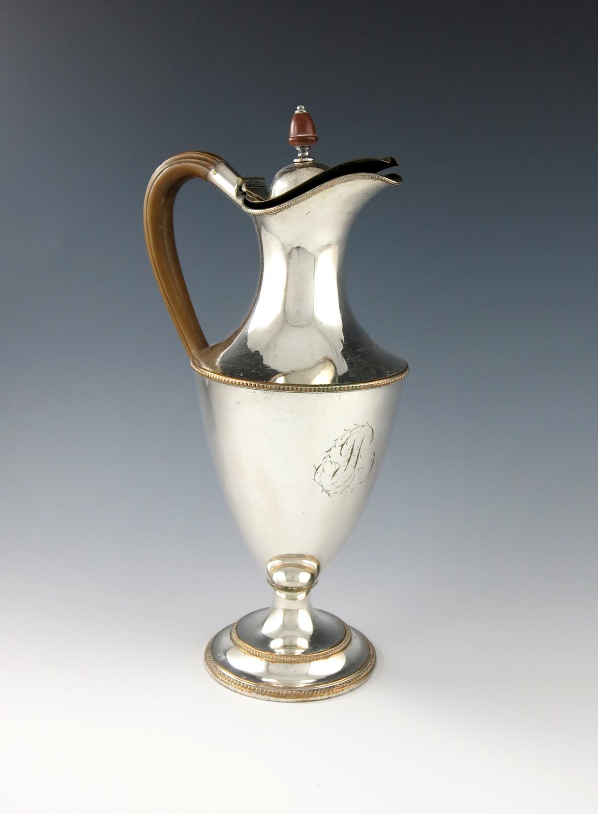 vase form, scroll handle, beaded borders, with a monogram, on a circular beaded foot, height 31.5cm.