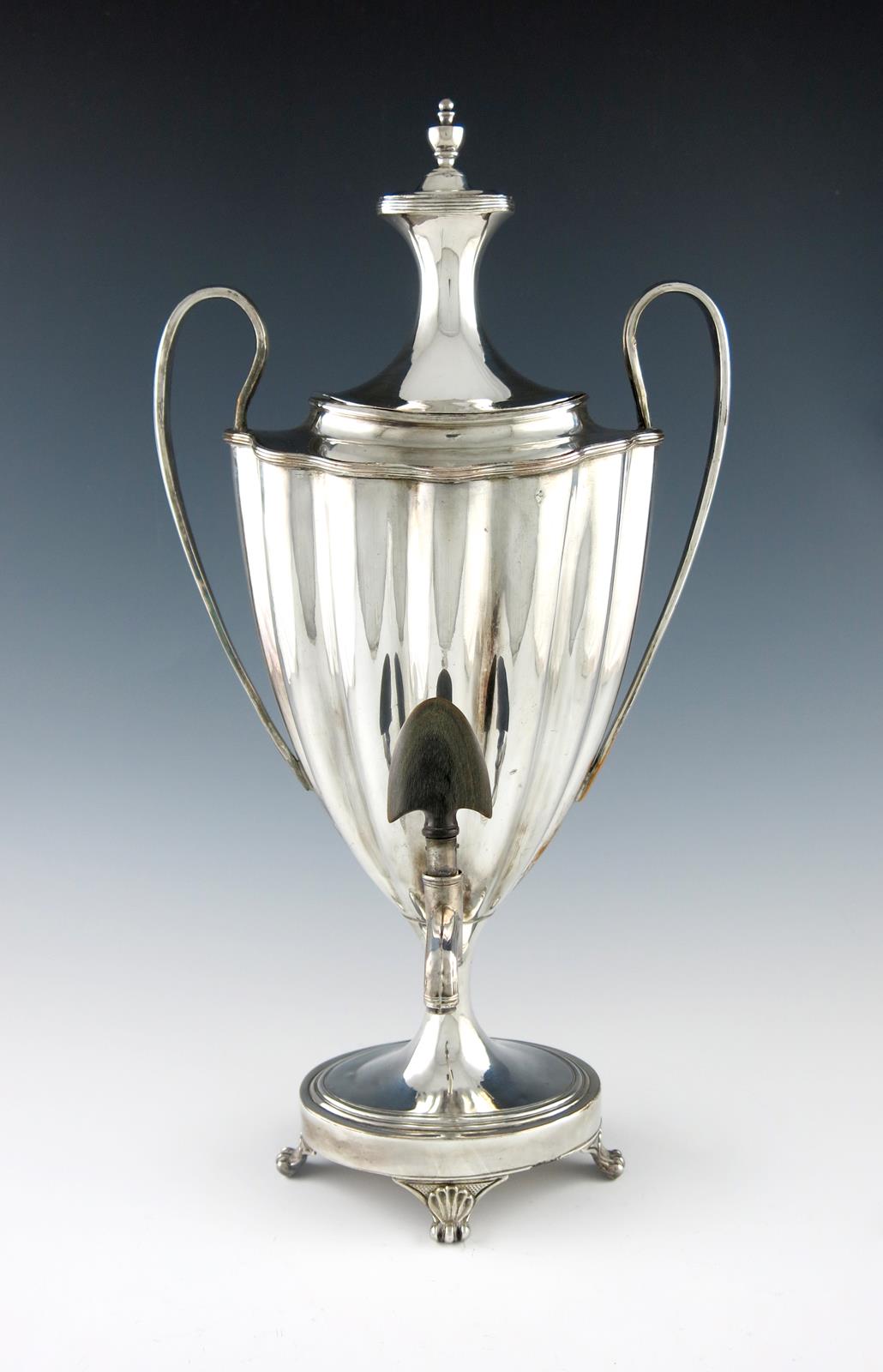 fluted oval form, loop handles, pull-off cover with an urn finial, on a raised oval base on four shell scroll feet, height 43.3cm.