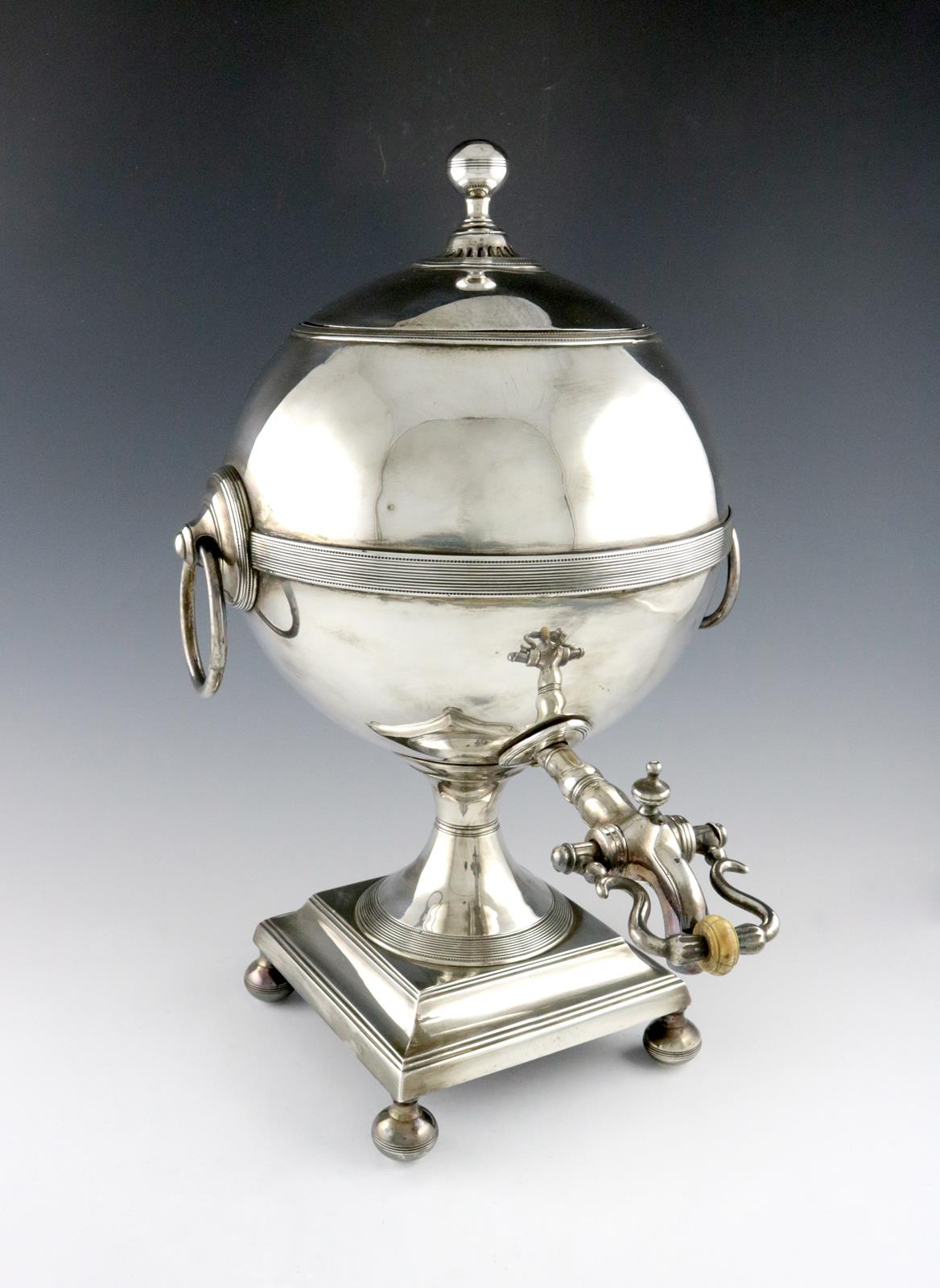 globular form, drop ring handles, reeded girdle, the domed cover with a ball finial, on a raised square base on four ball feet, height 43cm.