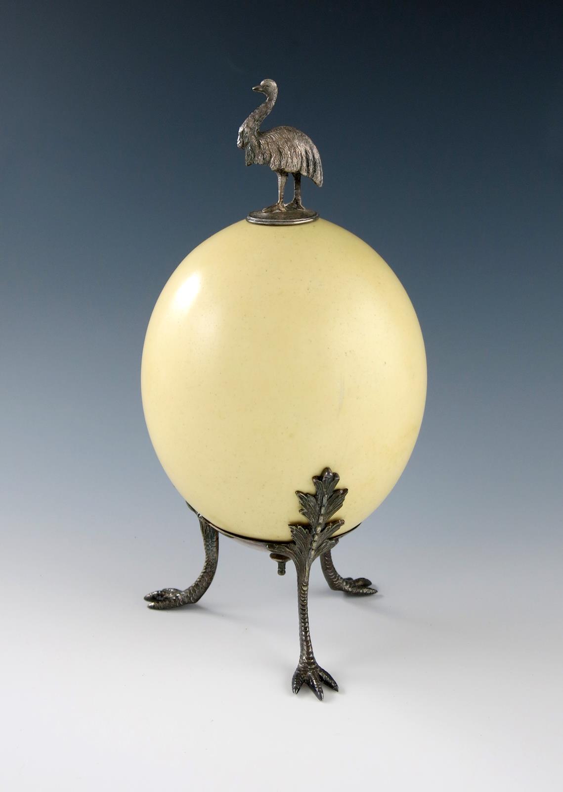 mounted with a standing emu, on three leaf capped claw feet, height 29cm.