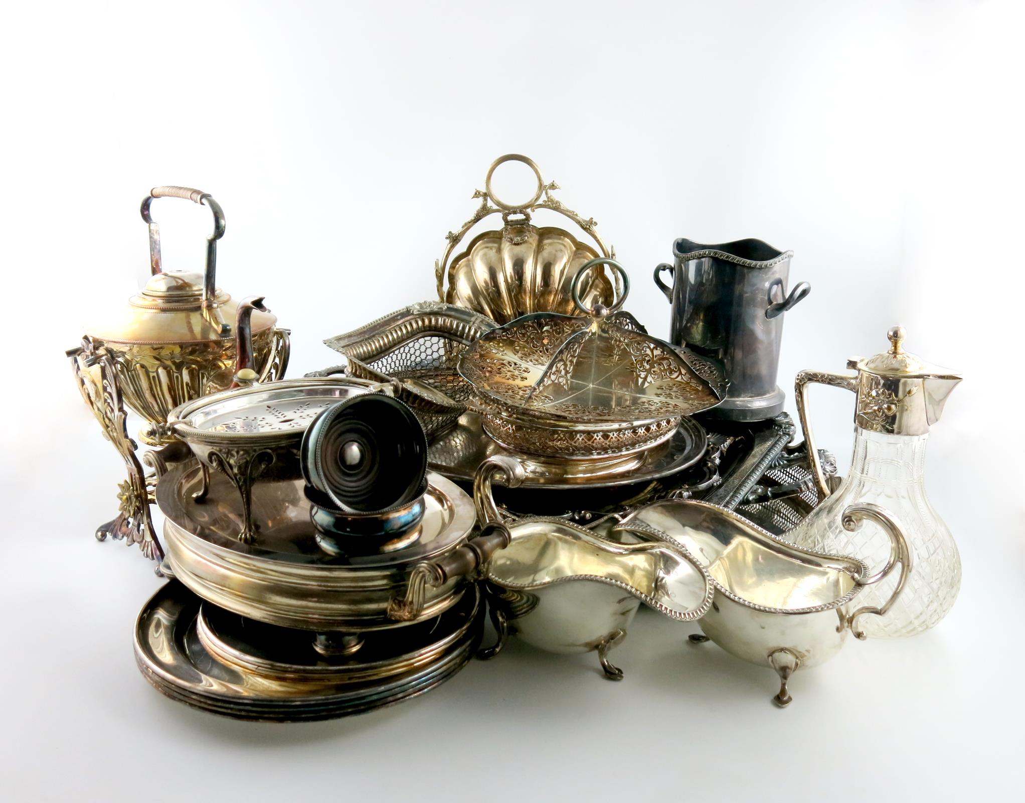 comprising: a biscuit box, of fluted shell form, hinged flaps, an electroplated mounted claret jug, a kettle on stand, a pierced dish, a warming stand, a pair of toast racks, a platter, a revolving butter dish, a siphon stand, a pair of coasters, seven plates, a salver, a gallery tray and other items. (qty) (two boxes)