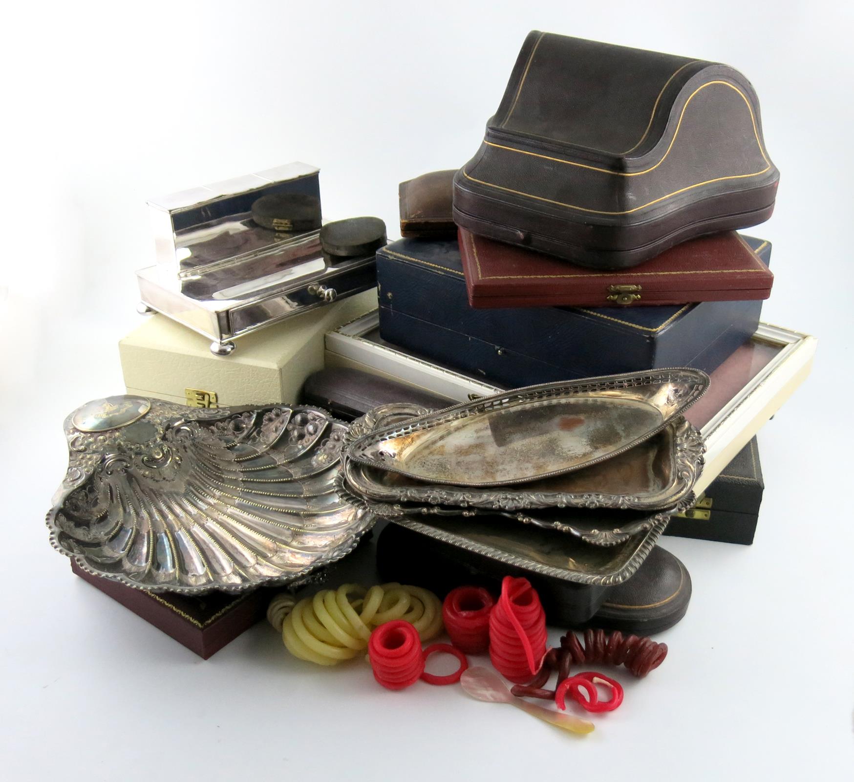 comprising: an old Sheffield plated inkstand, of rectangular form, with three hinged covers, and a pull-out drawer, plus a shell dish, three snuffers' trays, wax cords for wax jacks, various empty cases and other items. (qty)