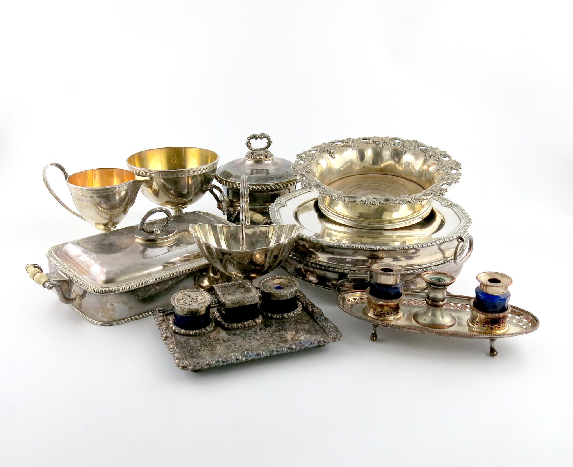 comprising: a sauce tureen and cover, of circular form, gadroon border, on four paw feet, a cream jug and sugar bowl, a two-handled cheese warming dish, a pair of circular warming stands, a swing-handled basket and a wine coaster, and two inkwells. (10)
