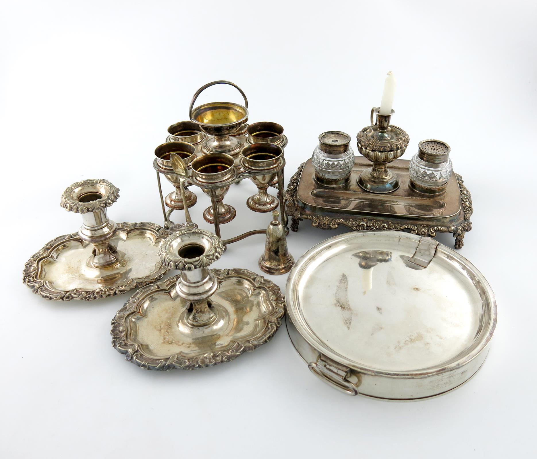 comprising: an inkstand of rounded rectangular form, foliate border, with a central miniature chamber stick, plus an egg frame with six egg cups, a pair of chamber sticks, and a warming stand. (5)