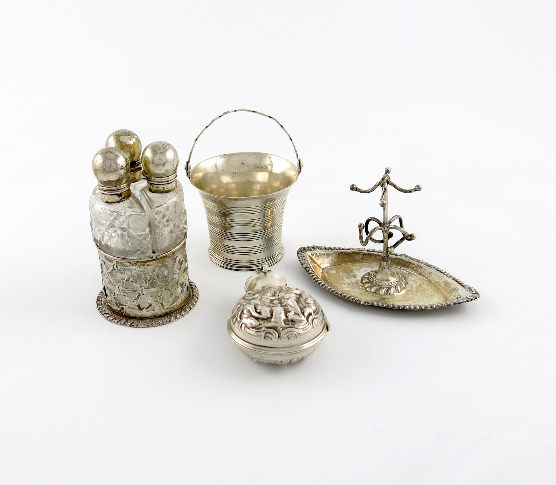 comprising: three scent bottles in a circular stand, Birmingham 1904, a cream pail, London 1900, a smelling salts bottle in a silver case, and a ring tree, approx. weighable 6.8oz. (4)