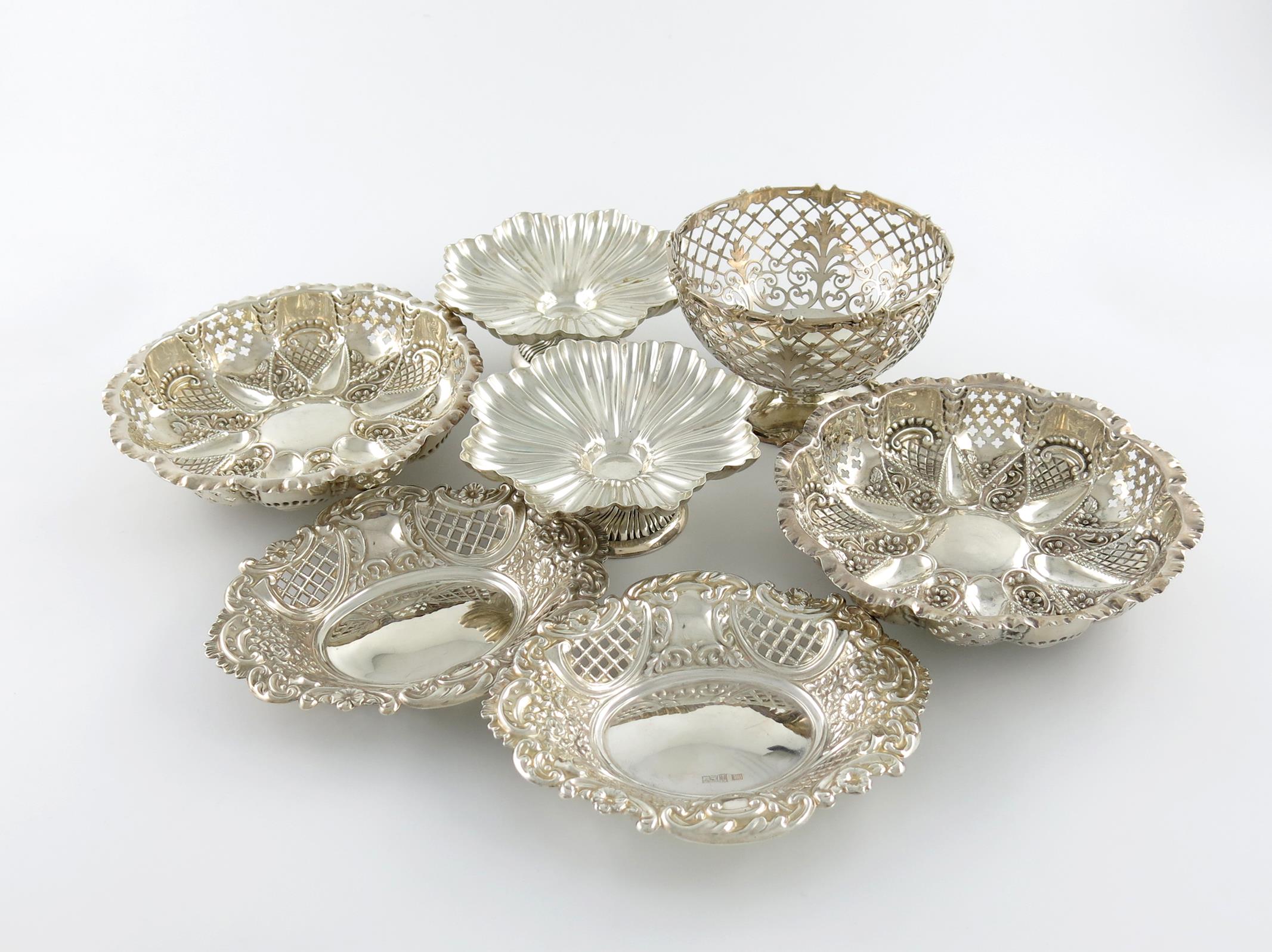 comprising: one of pierced circular form, Sheffield 1930, a pair of fluted tazzae, a pair of circular dishes, approx. weight 28oz. (7)