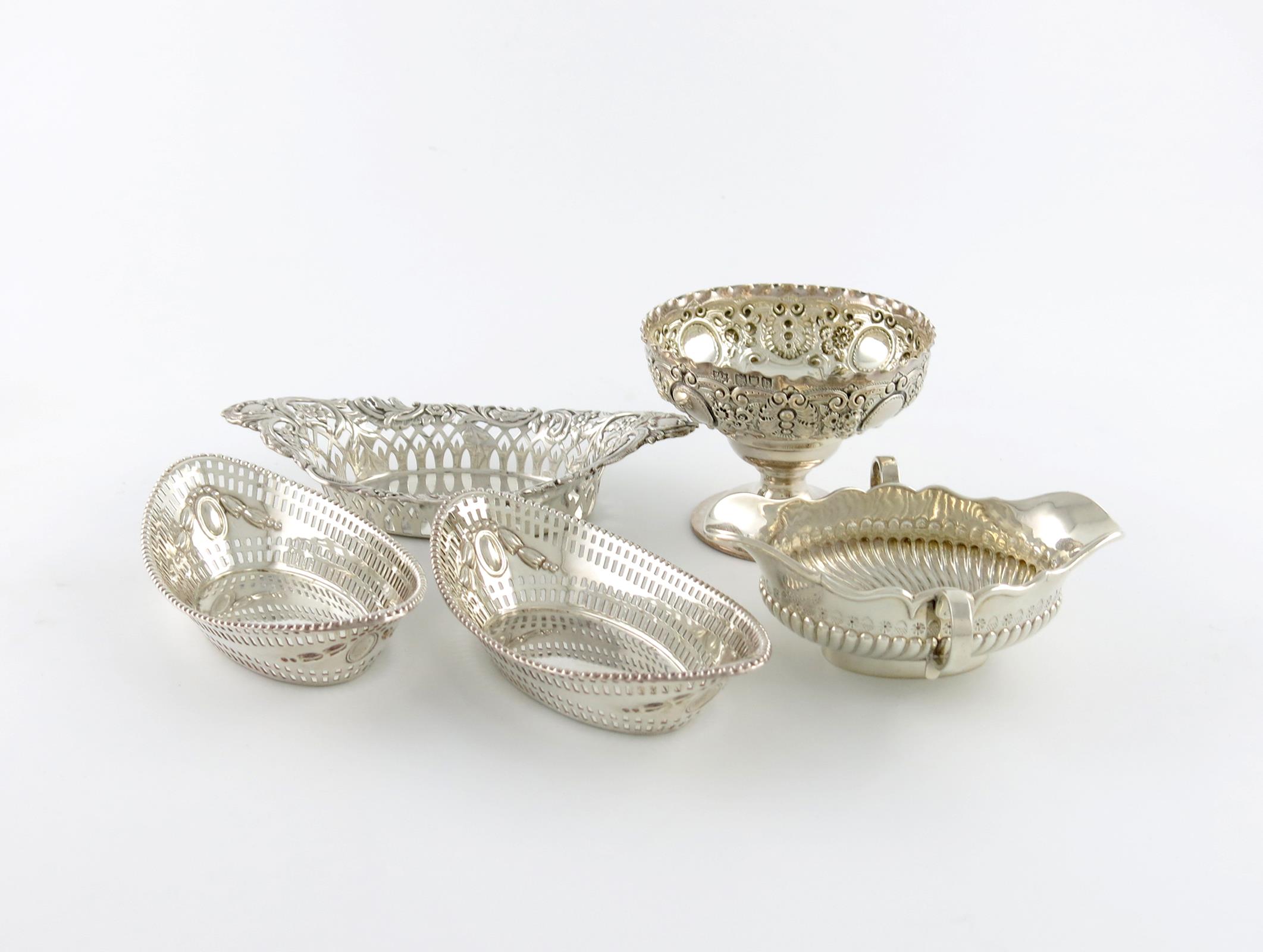 comprising: a Victorian double lipped sauce boat, London 1892, oval form, fluted decoration, plus a pair of pierced bonbon dishes, a single bon bon dish and a circular bowl on a raised circular foot, approx. weight 10oz. (5)