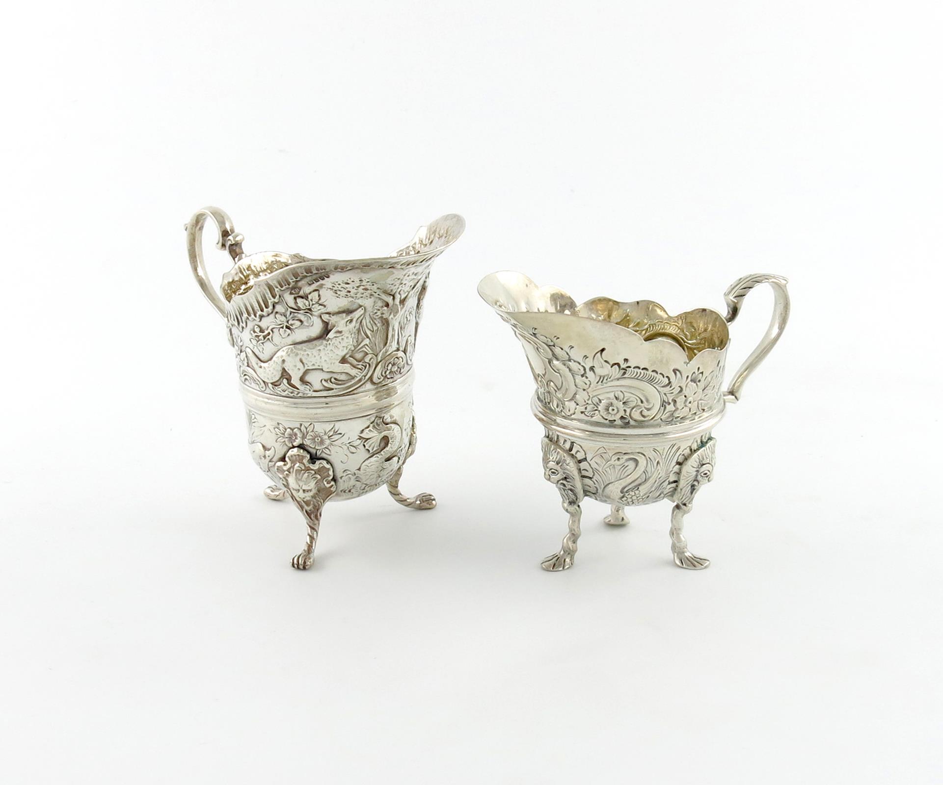 helmet form, decorated with animals and foliate scroll decoration, on four scroll feet, plus another similar, Birmingham 1898, approx. weight 9.5oz. (2)