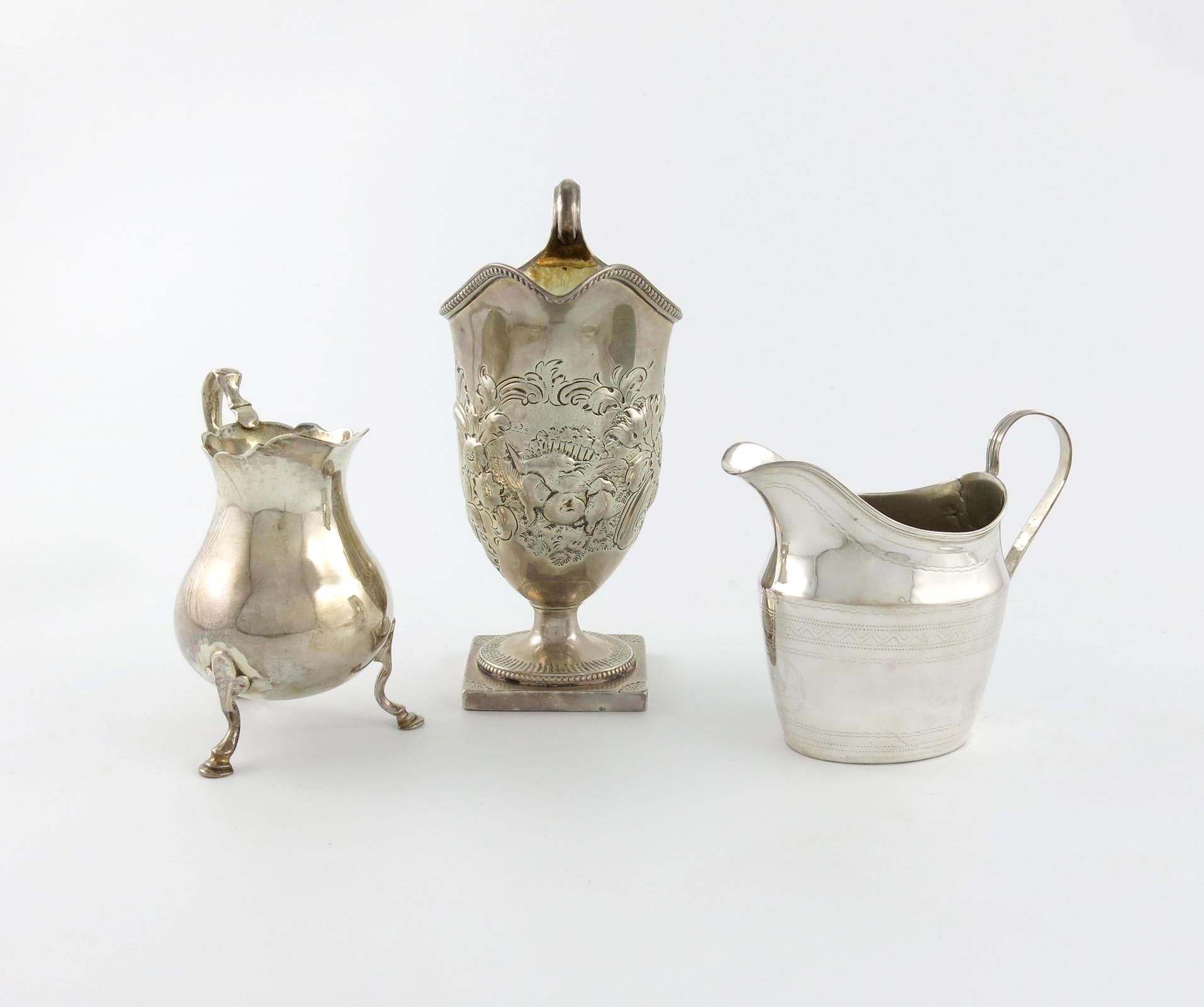 comprising: one by Wakelin and Taylor, London 1786, helmet form, later embossed foliate decoration, on a square foot, one of oval form, London 1798, and one of baluster form, London 1758, on three hoof feet, approx. weight 12.5oz. (3)