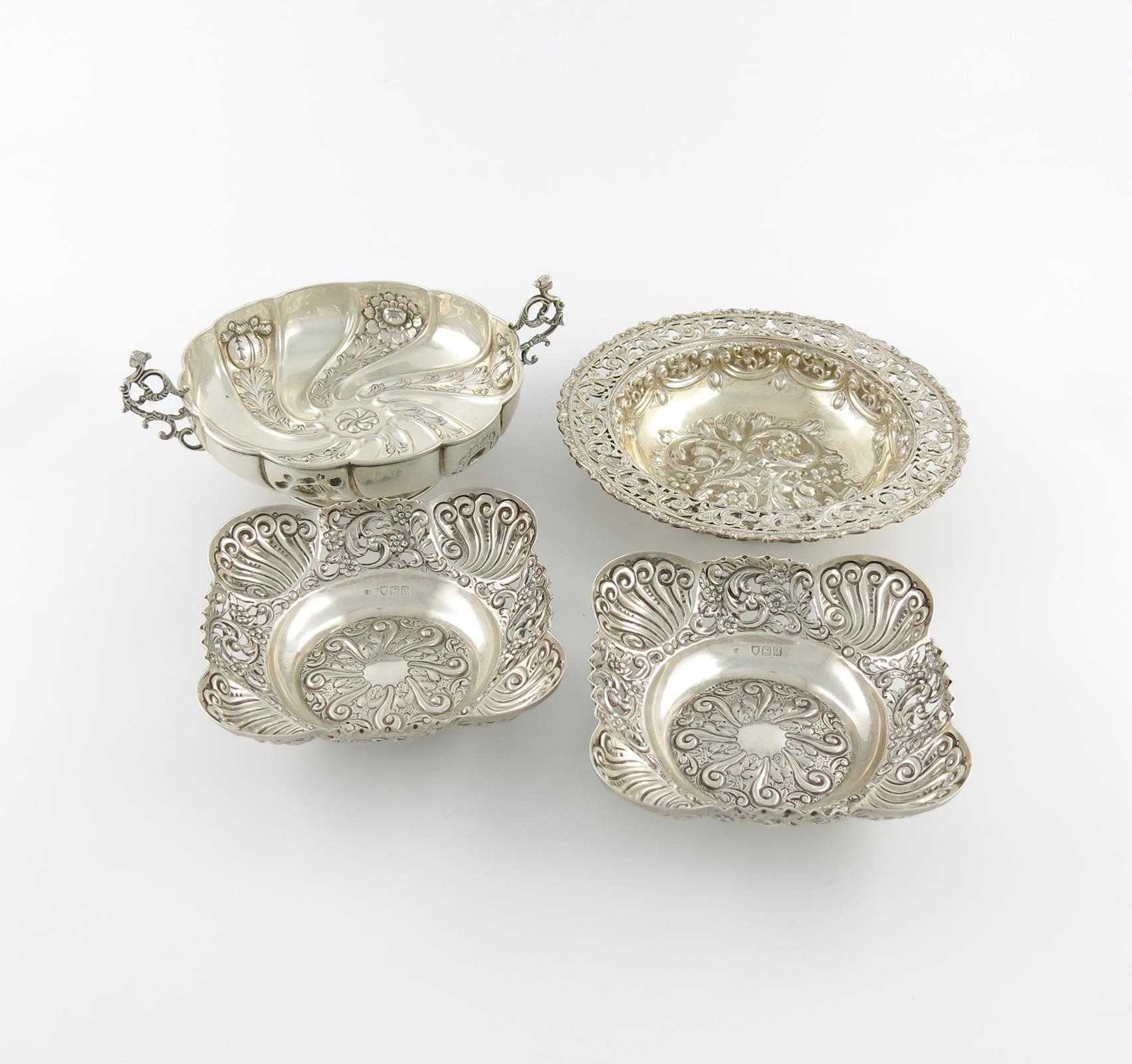 comprising: a pair of square form, embossed decoration, London 1896, a pierced circular dish, and another dish with foliate scroll handles, approx. weight 24oz. (4)