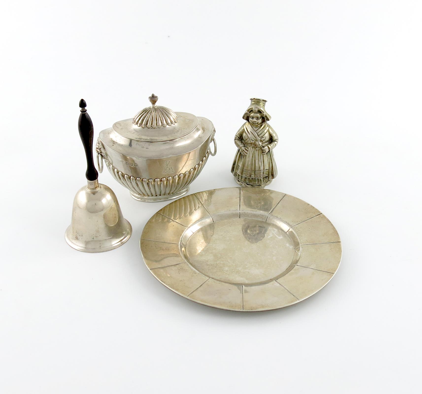 comprising: an Edwardian tea caddy, by Charles Stuart Harris, London 1903, a Victorian butter dish stand, an American table bell, and a Dutch model of a standing girl in traditional dress, approx. weight 16oz. (4)