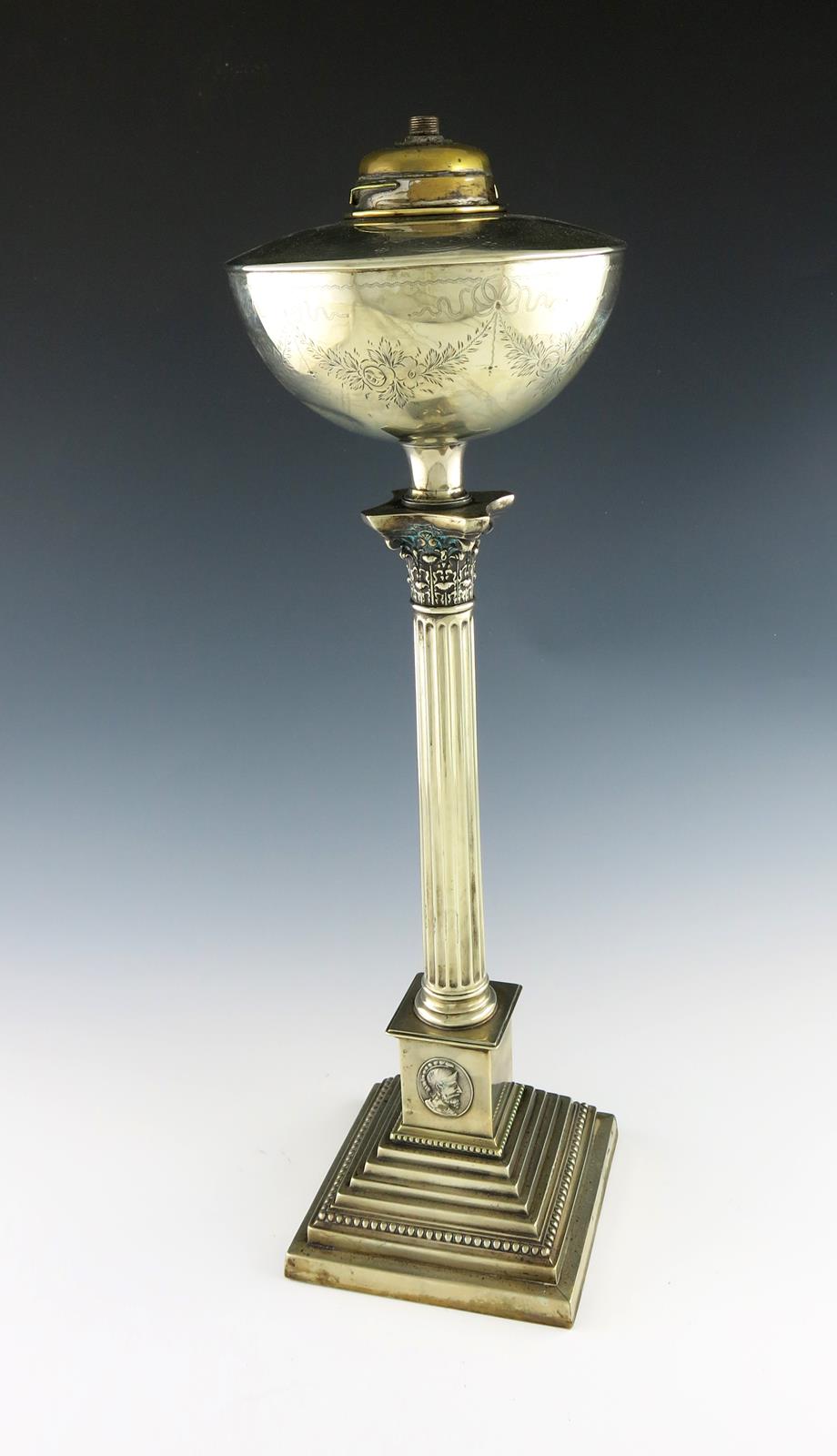 Corinthian column form, with a circular oil holder, engraved foliate decoration, on a stepped square base, height 54.5cm.