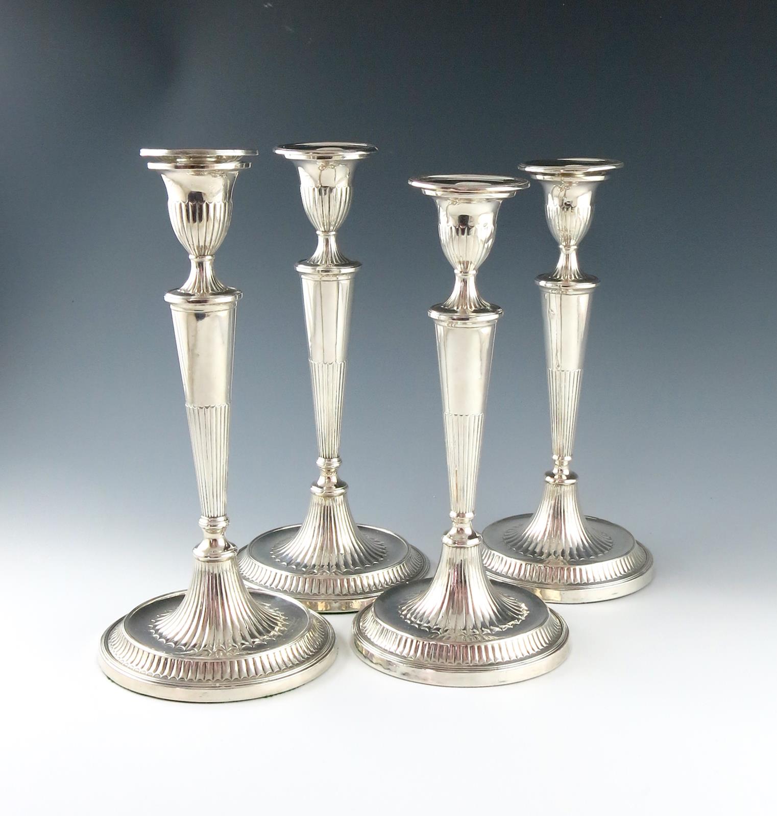 Two similar pairs of George III old Sheffield plated candlesticks,