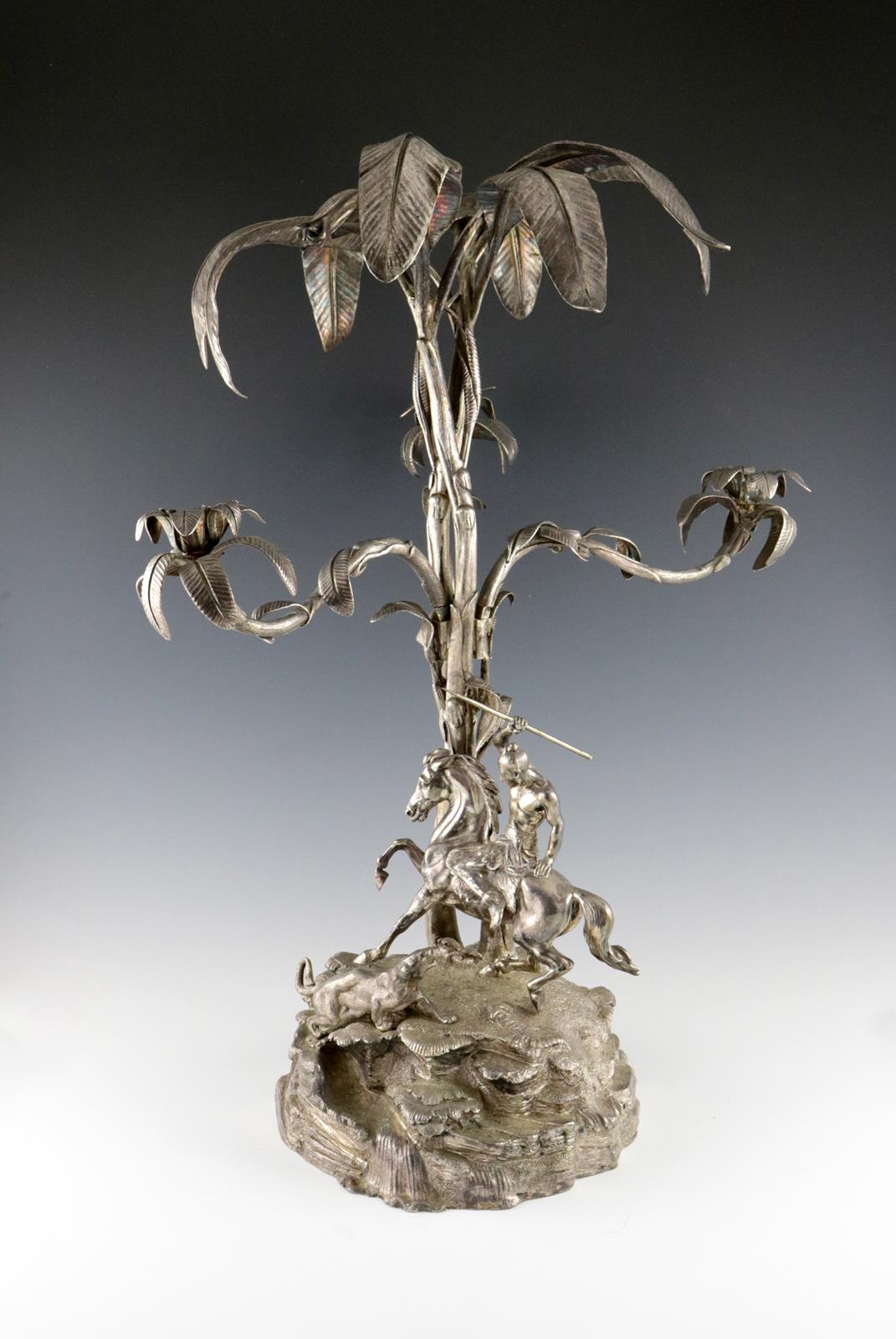 with a central tree with three arms each holding a capital, and with a central bowl support, on a rocky base mounted with a horseman attacking a big cat, height 60cm.