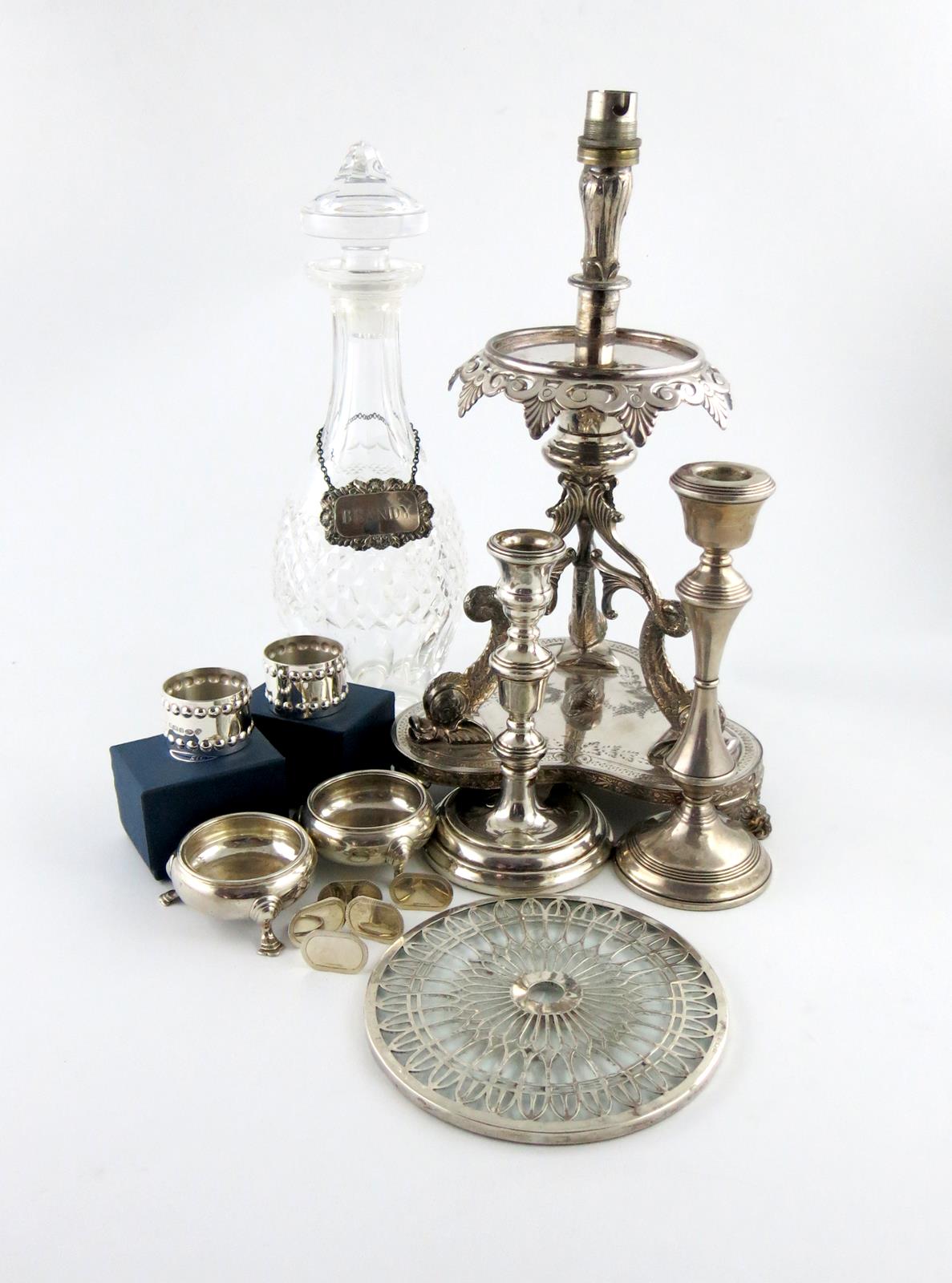 comprising silver items: a pair of George II salt cellars, by Fuller White and John Fray, London 1745, two single candlesticks, two napkin rings, five place markers, a teapot stand, a wine label and a glass decanter and an electroplated epergne, approx. weighable 7oz. (qty)