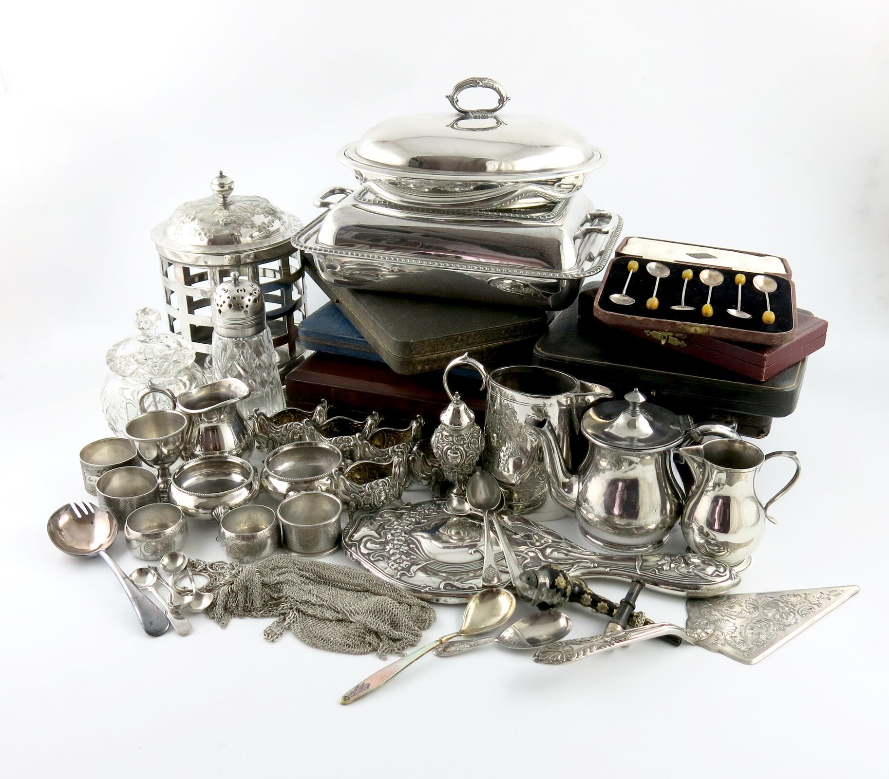 comprising silver items: a sparrow-beak jug, a pair of Victorian salt cellars, five napkin rings, five salt cellars, a pepper pot, an Austrian mesh bag, a caddy spoon, a hand mirror, six knives and six spoons, cased, and other items including a small quantity of electroplate, approx. weighable 27oz. (qty)