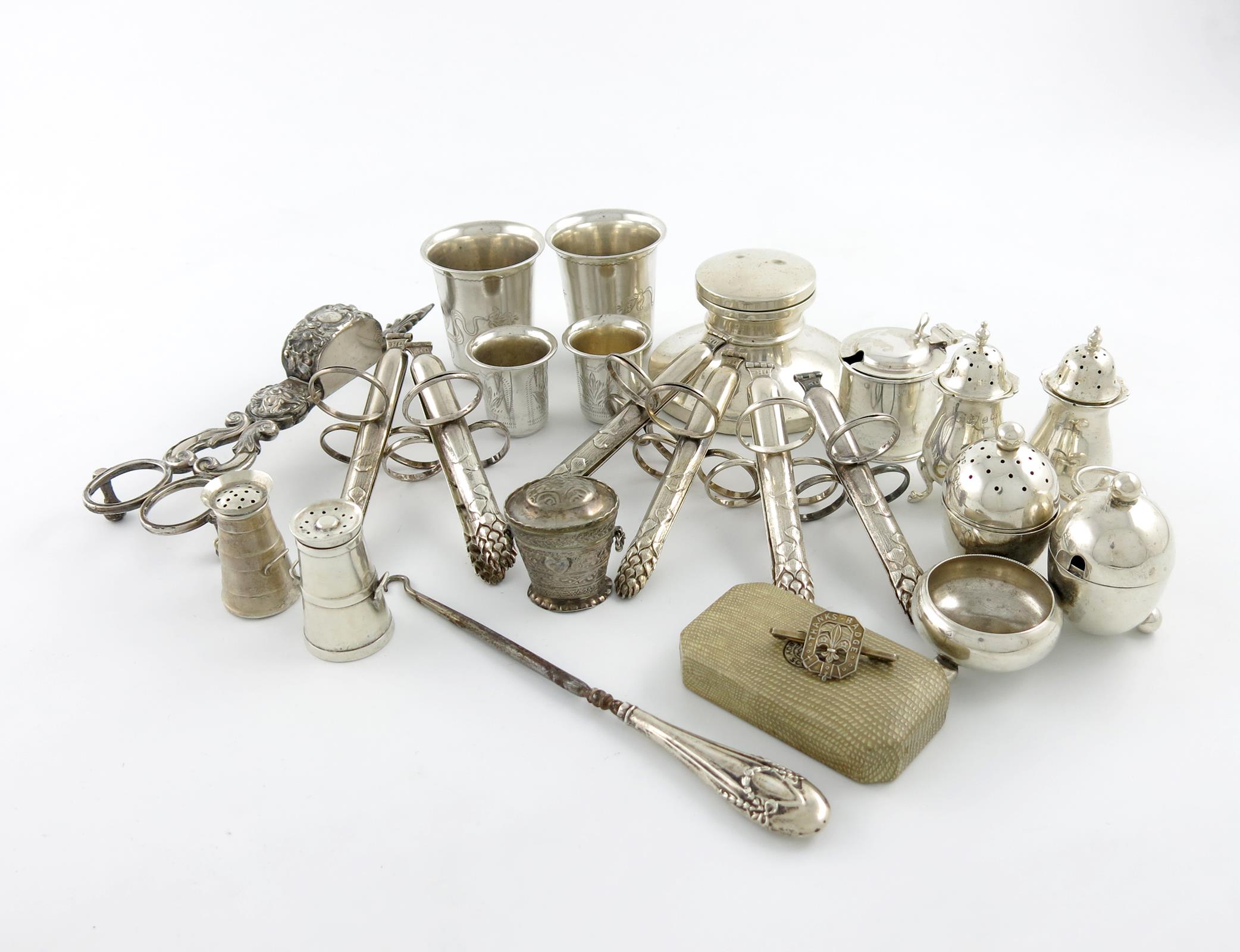 comprising silver items: a Victorian cruet frame, two churn pepper pots, a mustard pot, a pair of pepper pots, an inkwell, four Austrian beakers, a box, a cased Scout badge, plus other items including a set of six electroplated asparagus eaters, approx. weighable 12oz. (qty)