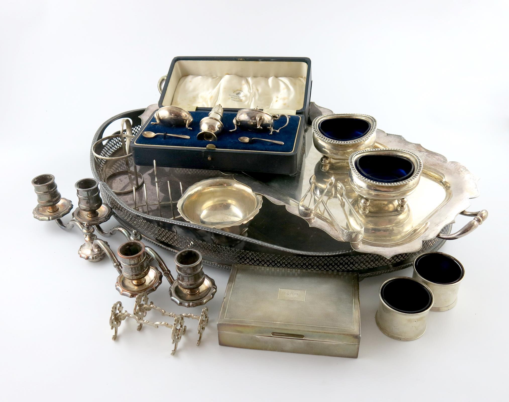 comprising silver items; a pair of George IV salt cellars, by Charles Fox, London 1827, oblong form, gadroon border, on four ball feet, with blue glass liners, a cased condiment, a sugar bowl, a toast rack, a tea glass holder, a pair of salt cellars, a pair of knife rests, a tea glass holder, plus two electroplated trays and two candelabra branches, approx. weighable 21oz. (qty)