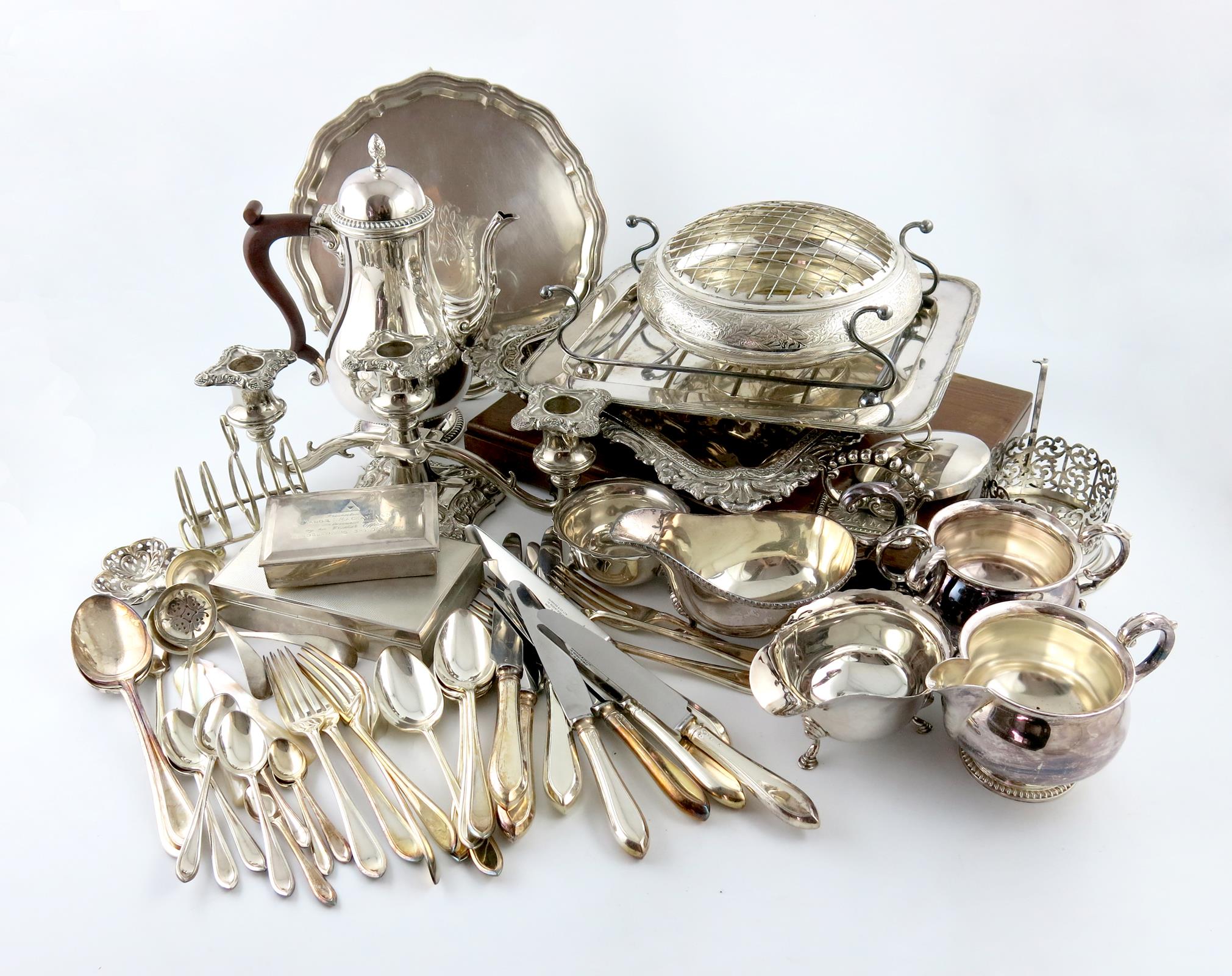 comprising silver items: a salver, by E. Viner, Sheffield 1964, two cigarette boxes, a sauce boat, a sugar bowl, and a quantity of electroplated items including a coffee set and flatware, approx. weighable 30oz. (qty)