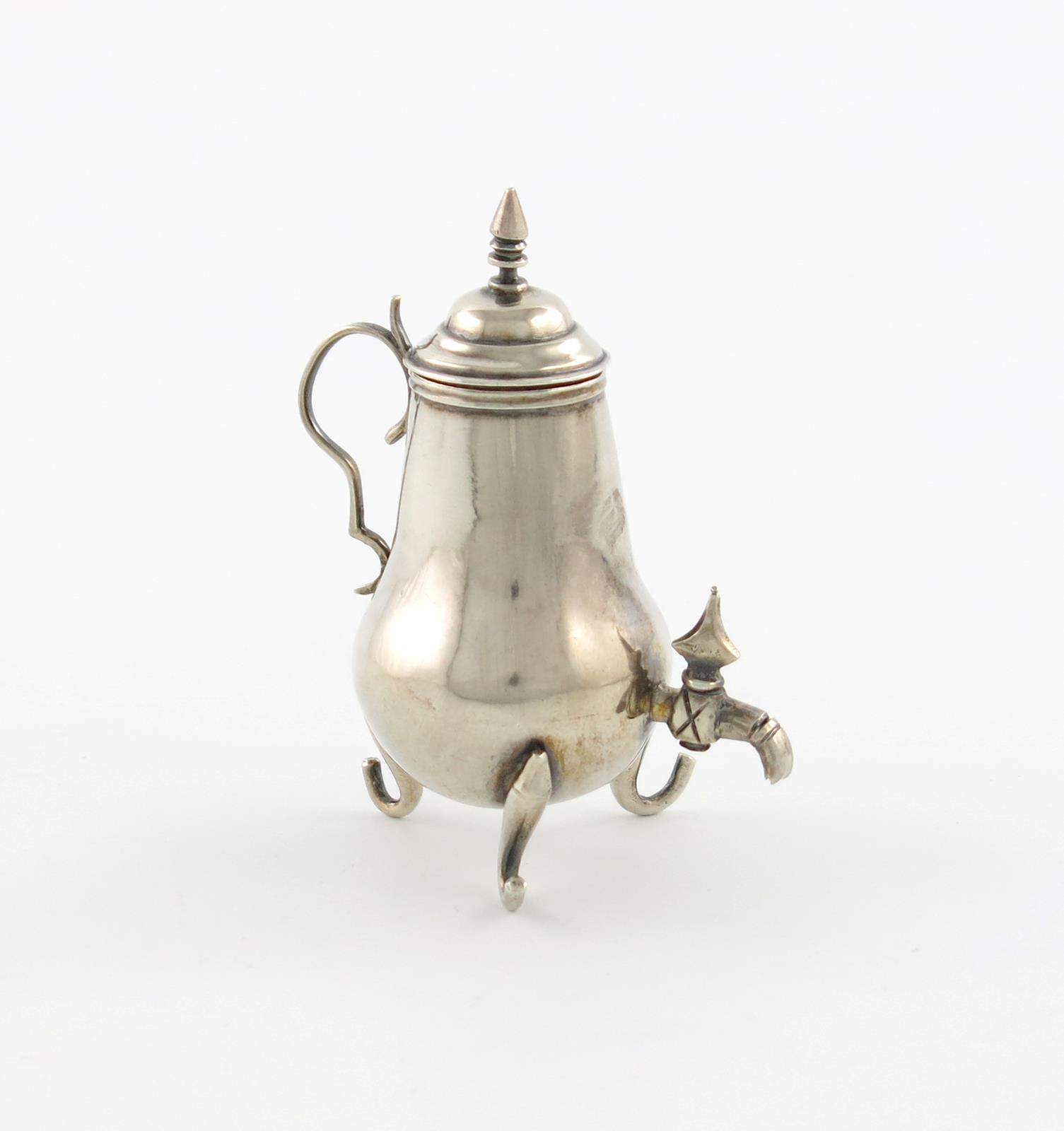 baluster form, scroll handle, the front with a tap, on three scroll legs, height 7.5cm, approx. weight 1.6oz.